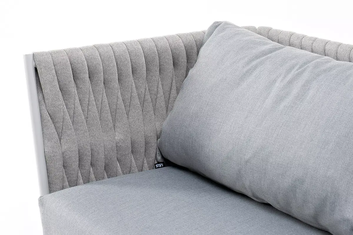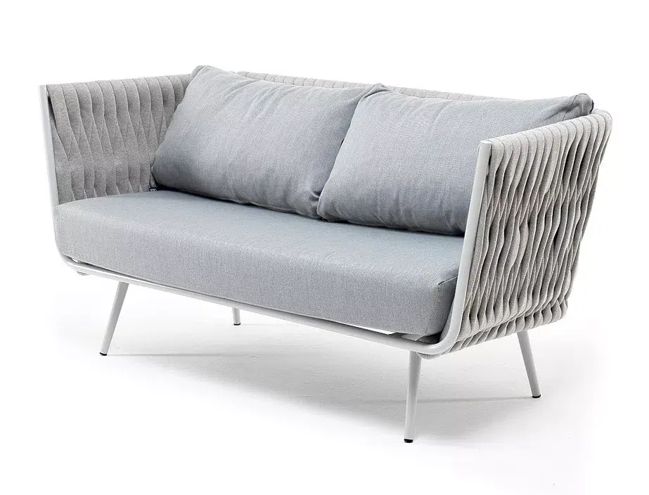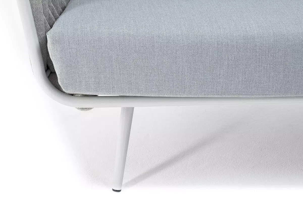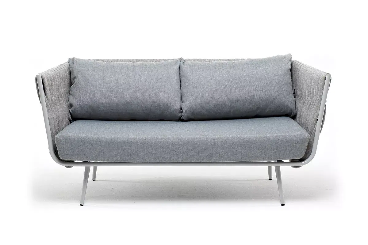 Диван имеет алюминиевый каркас, окрашенный порошковой краской в светло-серый (RAL7035) цвет. Боковины каркаса и спинка вручную оплетены роупом - эластичными синтетическими лентами, изготовленными из высокопрочных полиэфирных волокон. Цвет оплетки - светло-серый.