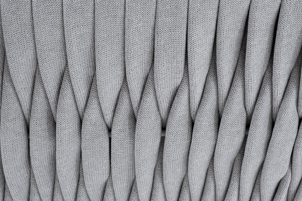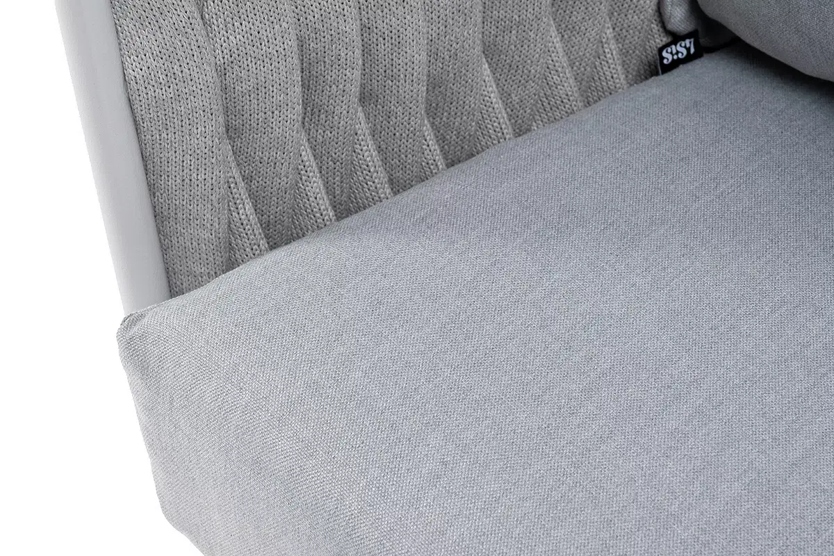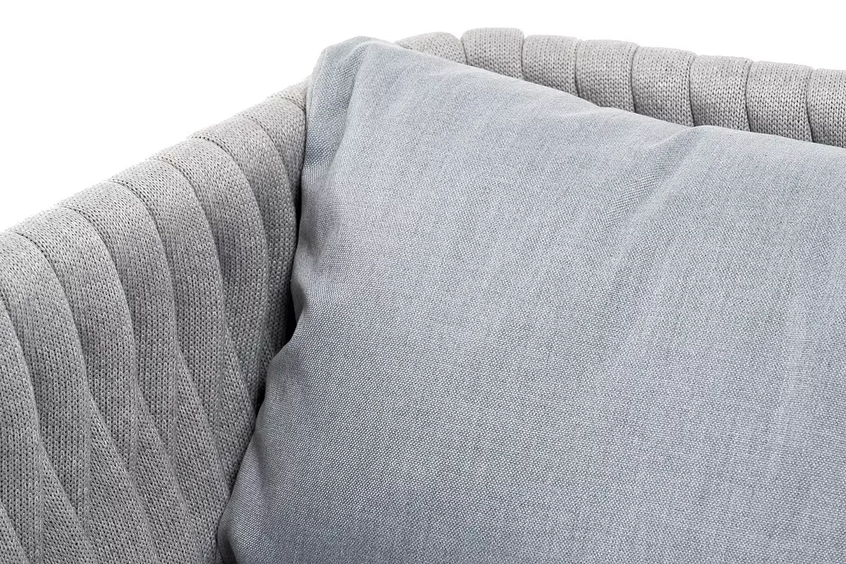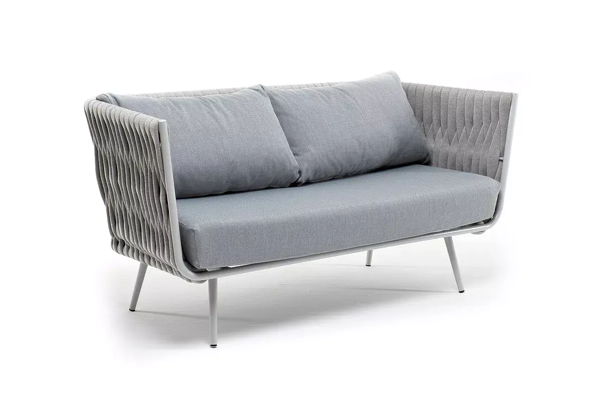 Диван имеет алюминиевый каркас, окрашенный порошковой краской в светло-серый (RAL7035) цвет. Боковины каркаса и спинка вручную оплетены роупом - эластичными синтетическими лентами, изготовленными из высокопрочных полиэфирных волокон. Цвет оплетки - светло-серый.