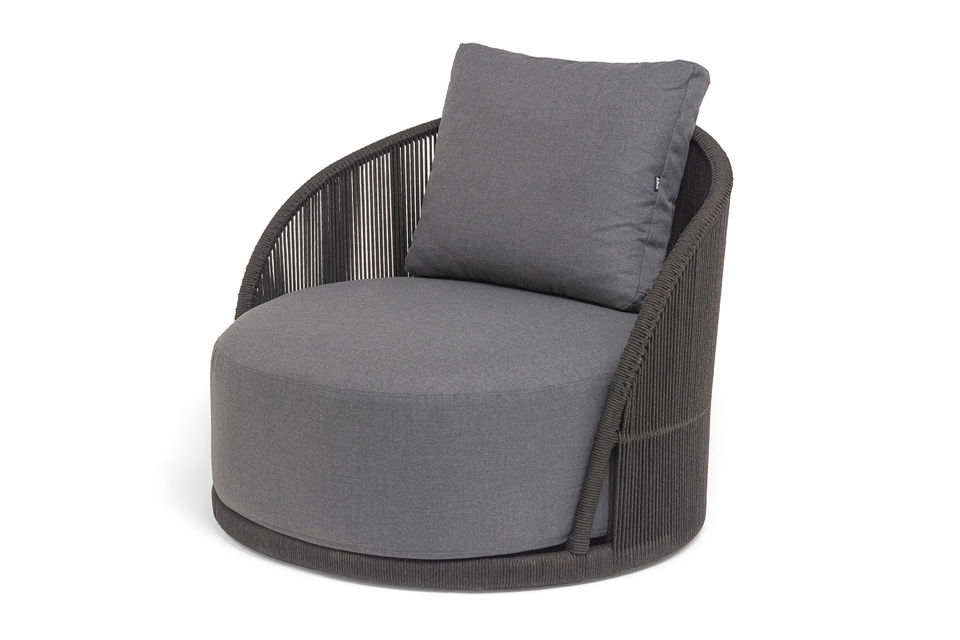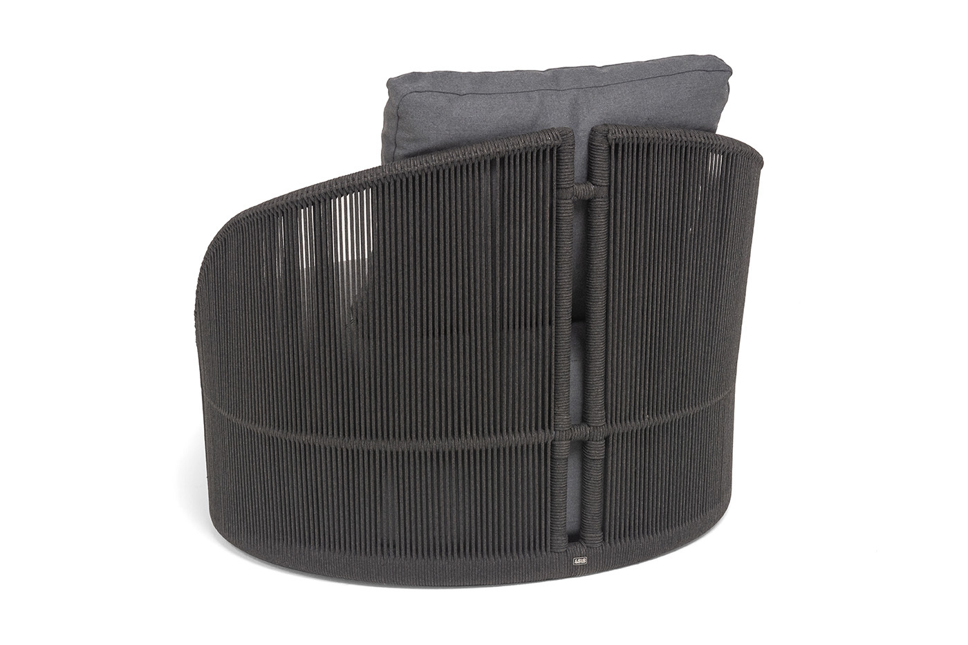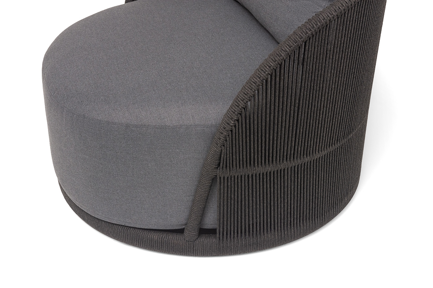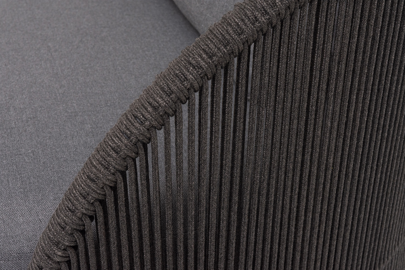 Боковины вручную оплетены роупом — эластичными синтетическими лентами из высокопрочных полиэфирных волокон. Однотонная темно-серая оплетка создает единый визуальный ансамбль с каркасом, подчеркивая лаконичность дизайна.