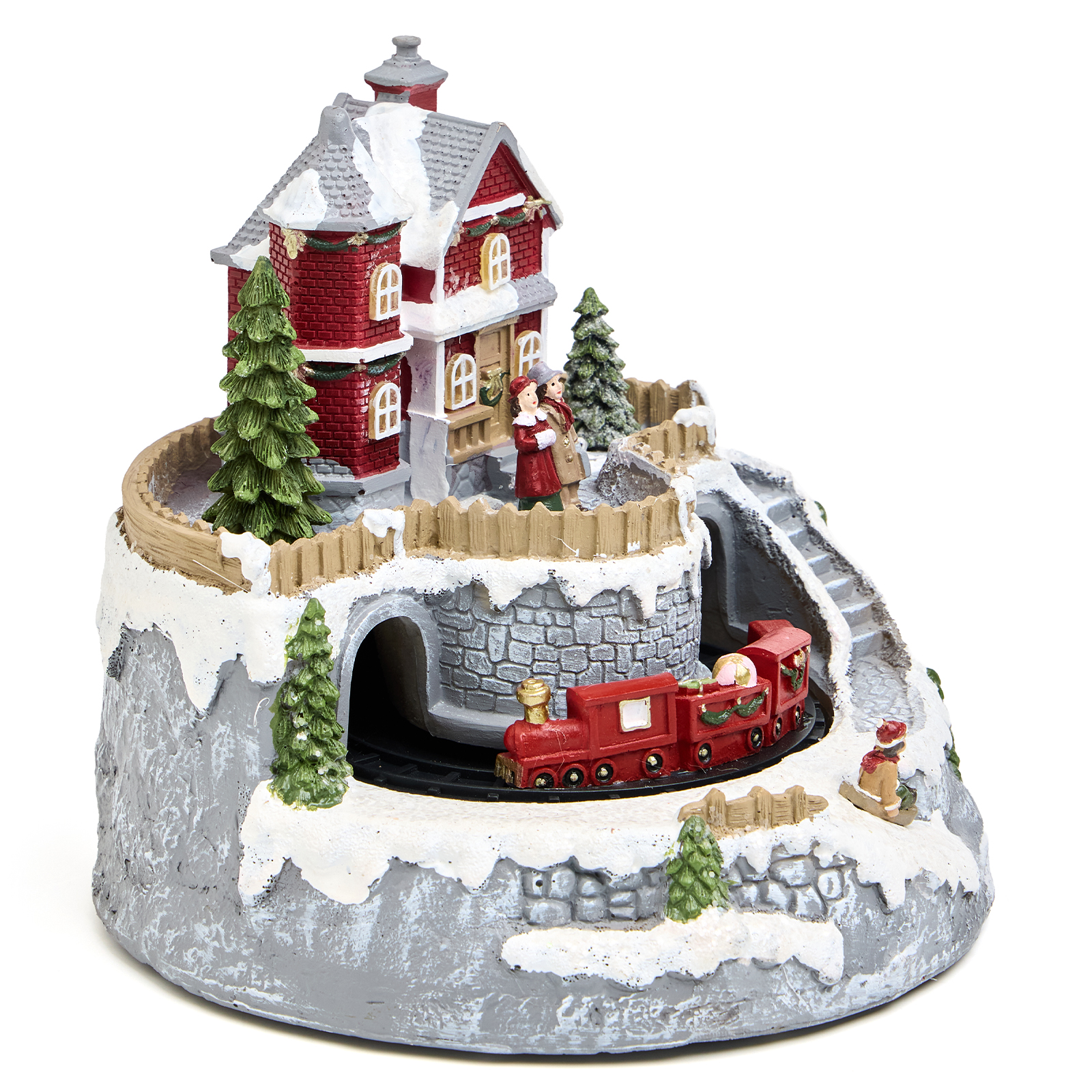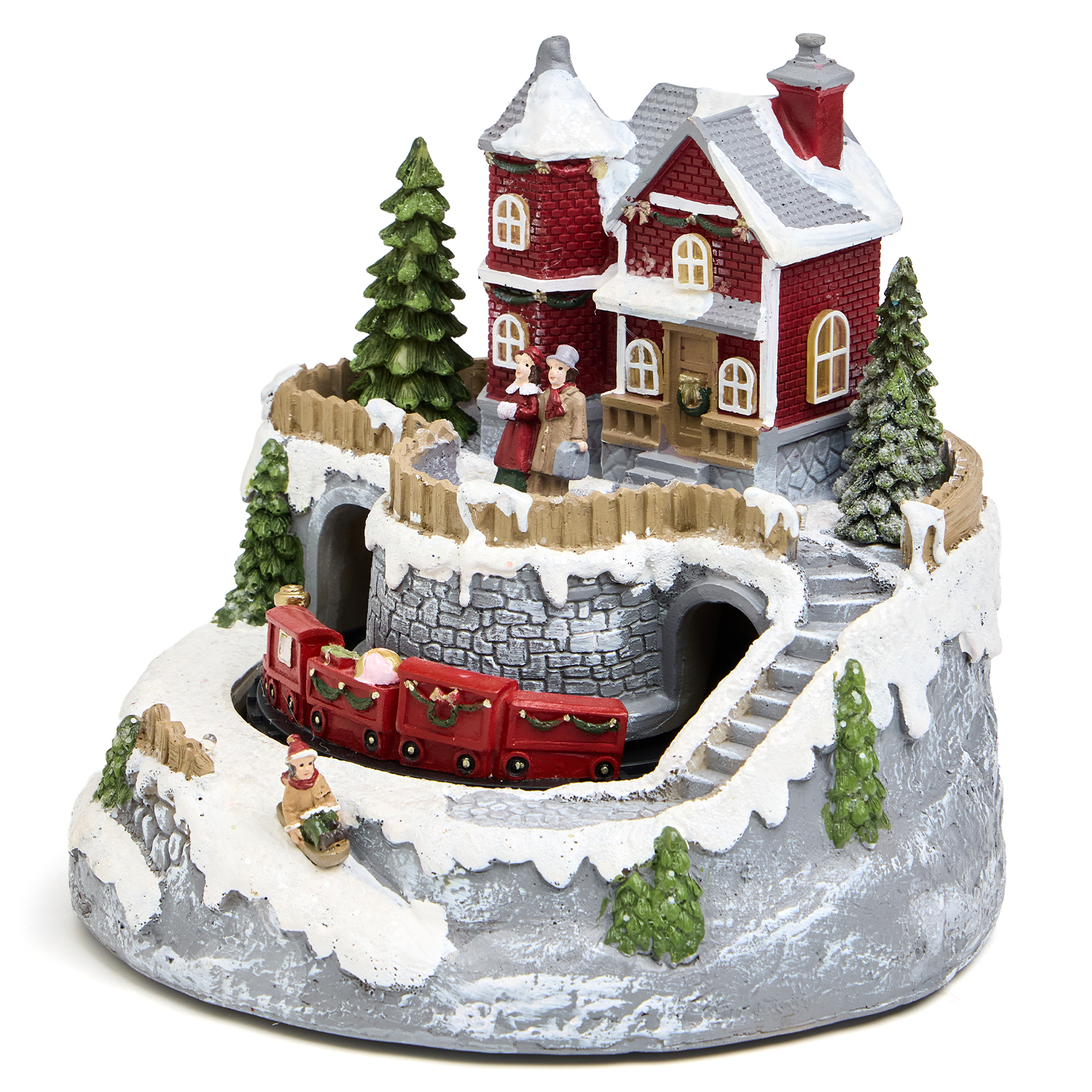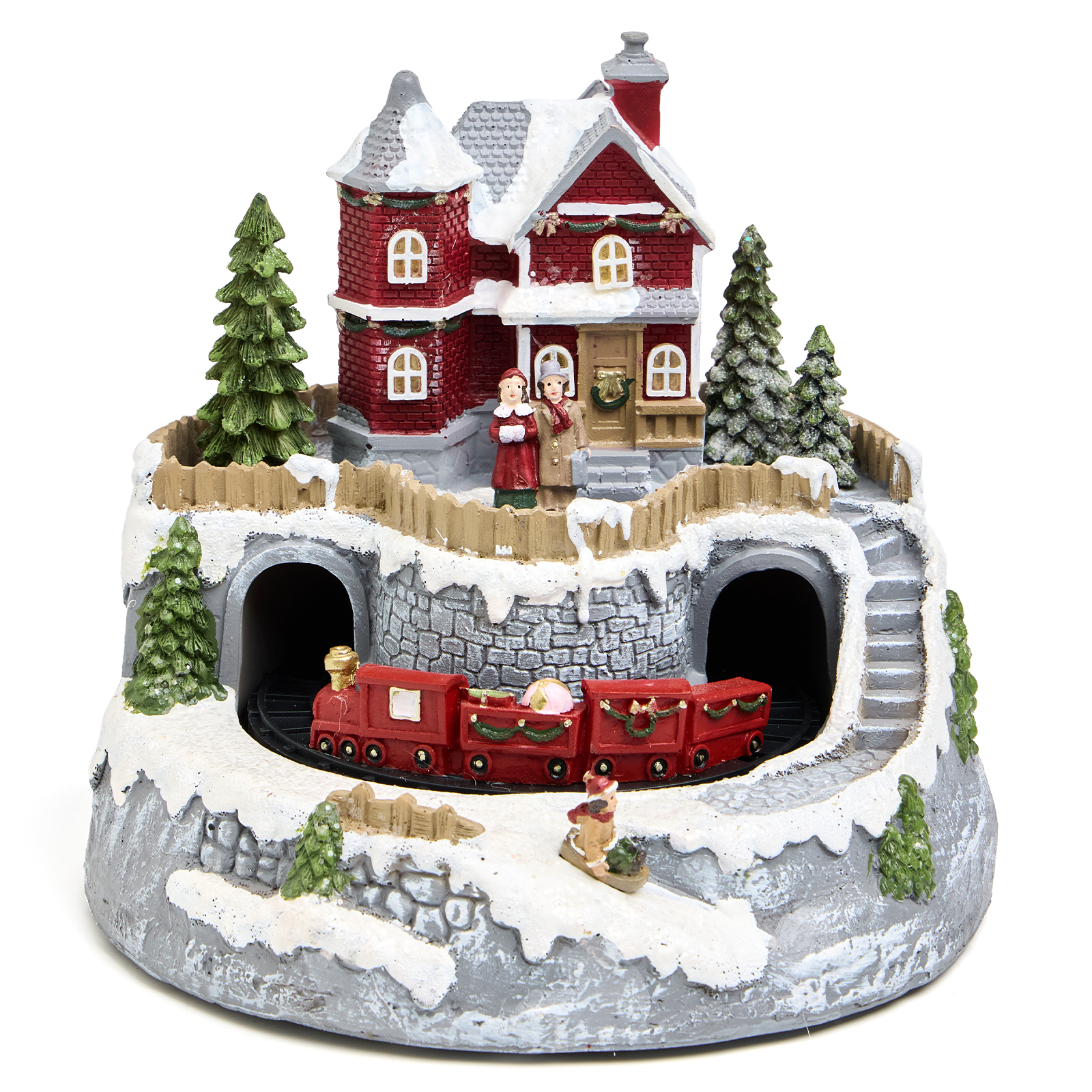 Уютный домик и заснеженные елки — всё это оживает под звук любимой рождественской мелодии. Красный поезд медленно катится по кругу, а окна домика мягко светятся, создавая волшебную атмосферу.