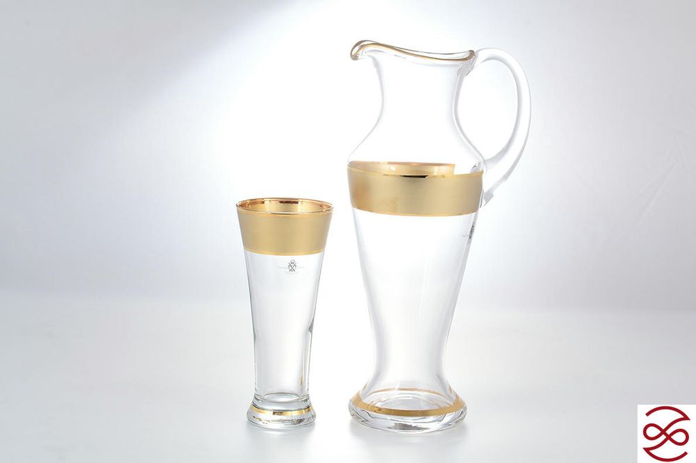 Изысканный, оригинальный и не похожий на остальные… Утонченный и грациозный кувшин для воды и соков, дополненный такими же изящными удлиненными стаканами. Дизайн комплекта украшает матовая золотая полоса как знак качества известного чешского бренда и гарантия долгой службы набора без потери товарного вида.