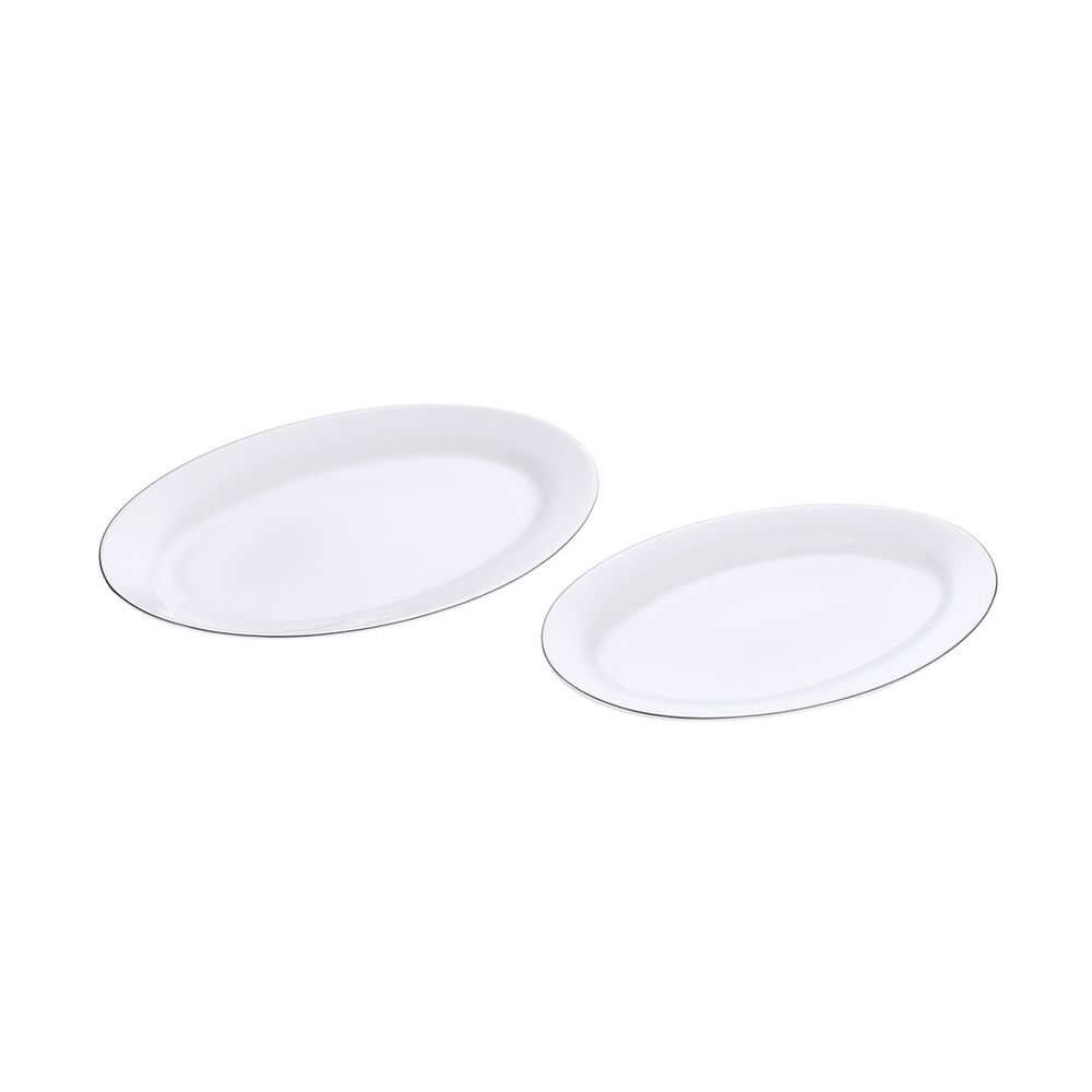 Набор блюд овальных Gipfel Eleganza 40802. В наборе 2 блюда размером 36 см и 41 см. Блюда сделаны из белого костяного фарфора с серебристым ободком по краю. Блюда подойдут для сервировки закусок или фруктов, сочетаются с другой посудой серии Eleganza.