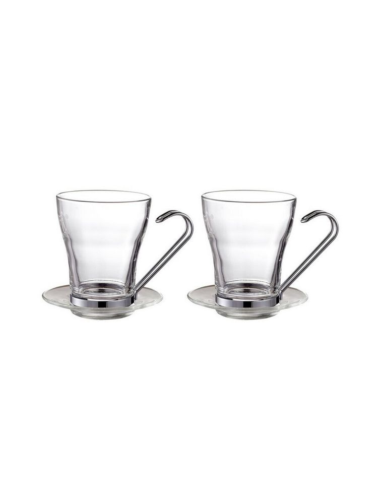 Посуда выполнена из прозрачного стекла. Ручка хромированная, металлическая. Можно купить кофейные чашки для капучино или использовать их с иными видами напитков: экологически безопасный материал, из которого они созданы, может контактировать с любыми пищевыми продуктами. Поверхность устойчива к воздействию металлических аксессуаров, также набор можно мыть в посудомоечной машине.