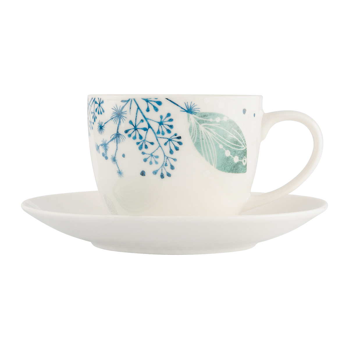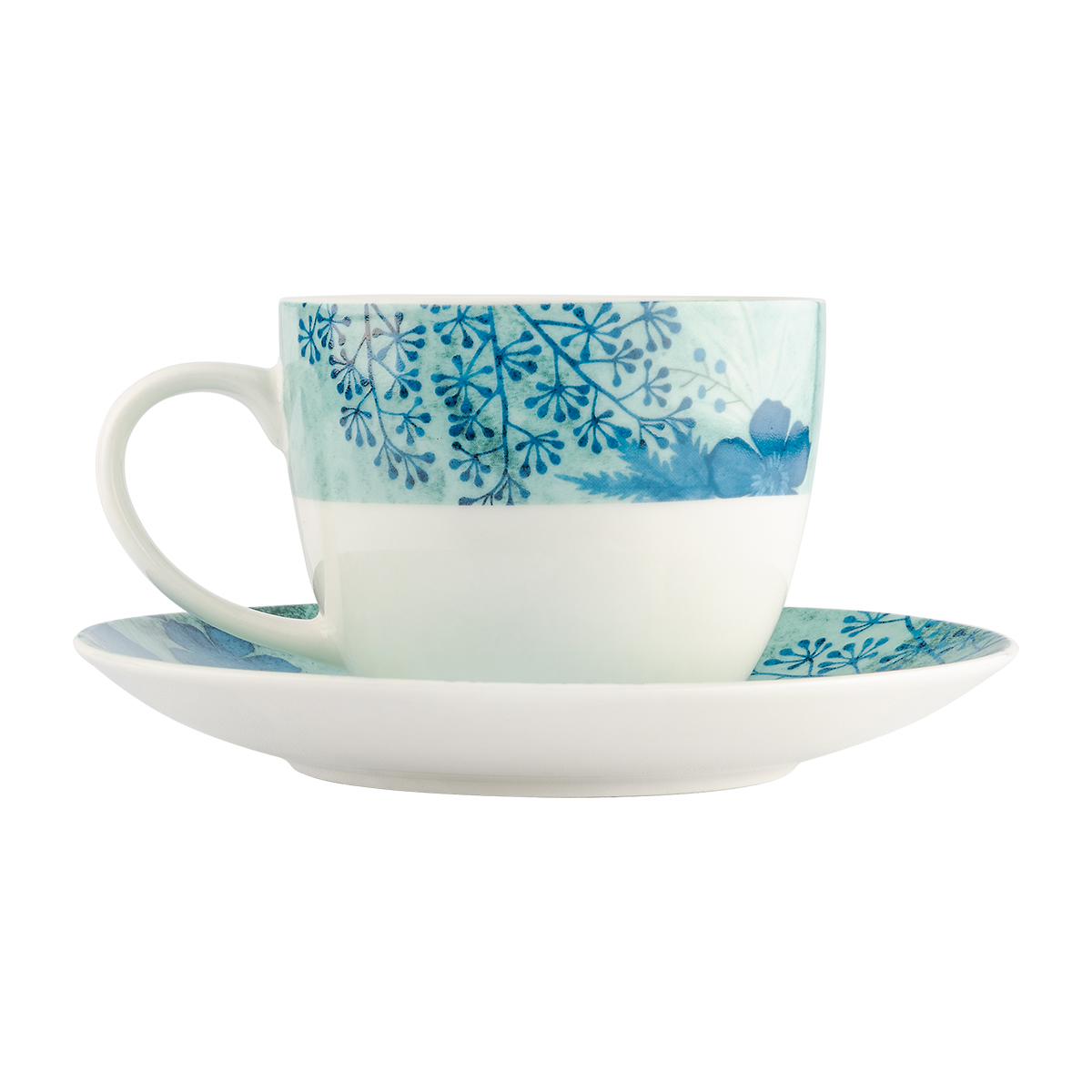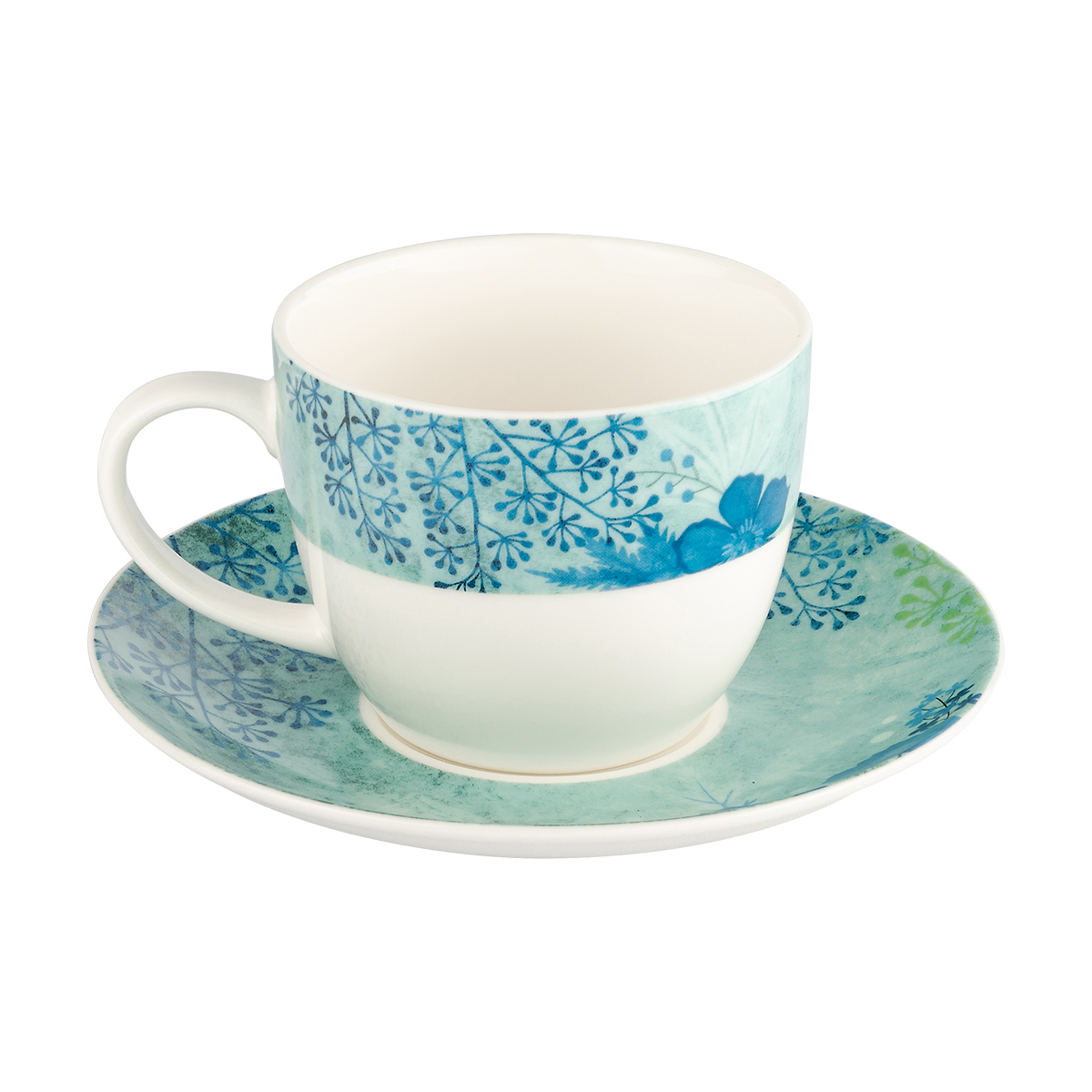 Набор чайный GIPFEL BLUE LAGOON 42248. В наборе 2 чашки объемом 250 мл, 2 блюдца диаметром 17 см. Чашки и блюдца изготовлены из белого фарфора с растительным рисунком синего и бирюзового цвета. Оригинальные предметы сервировки выполнены в одной стилистике, но отличаются цветом рисунка. Упакованы в подарочную коробку.