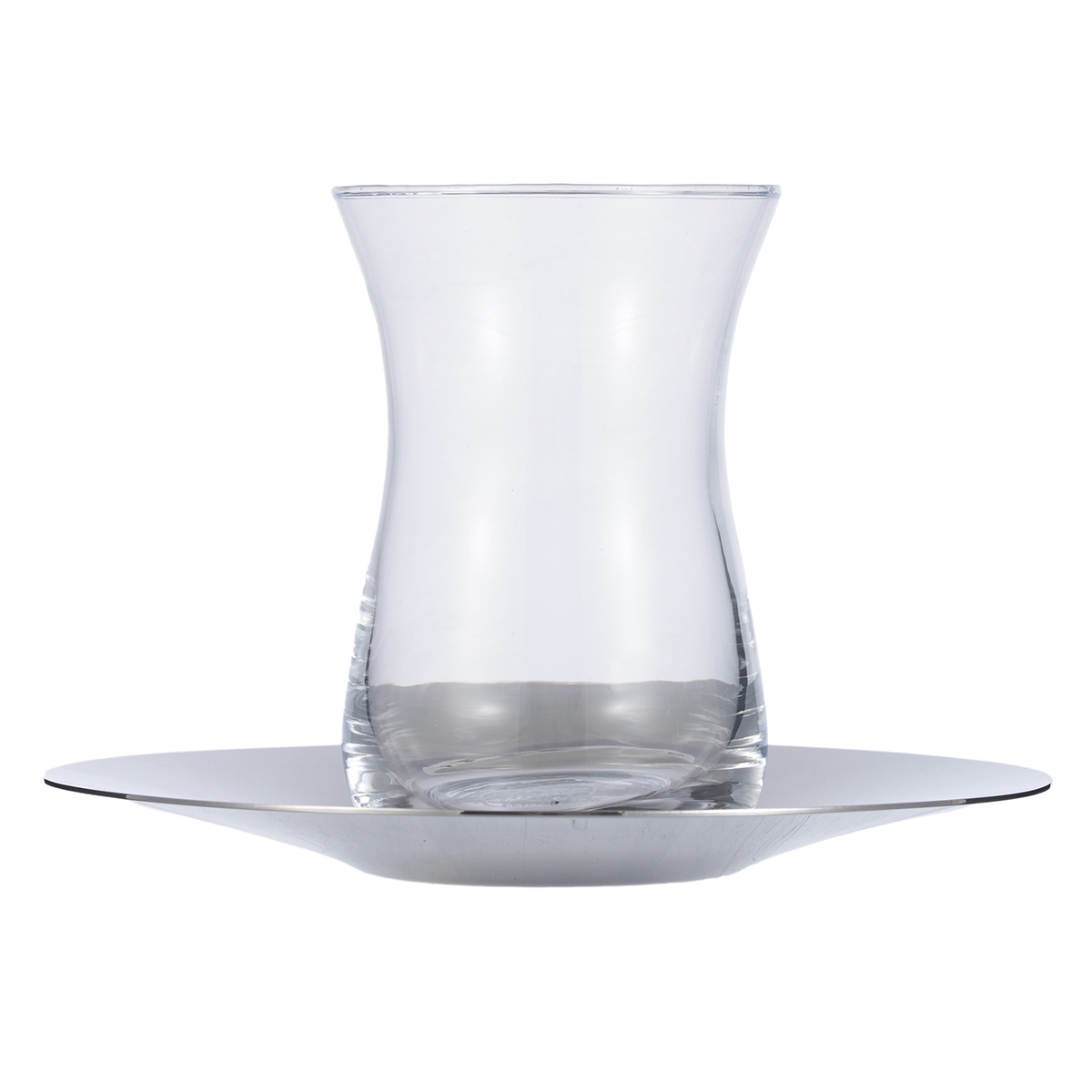 Изящные стаканы выполнены в оригинальном дизайне: стеклянные армуды прозрачные, а стальные блюдца с матовой полировкой. Подчеркнут сервировку стола и станут украшением любого чаепития.