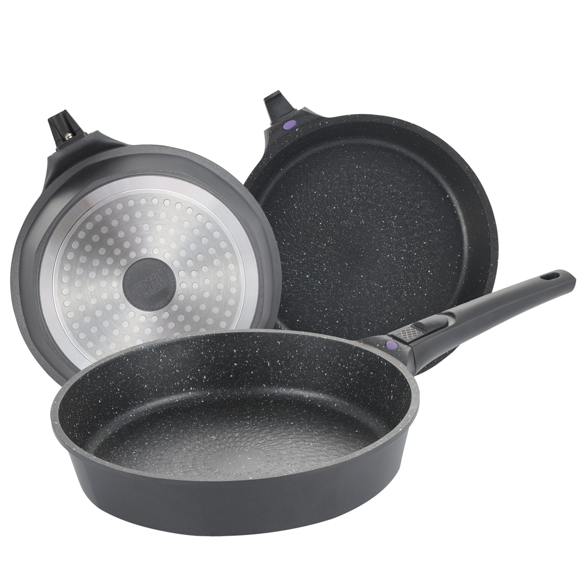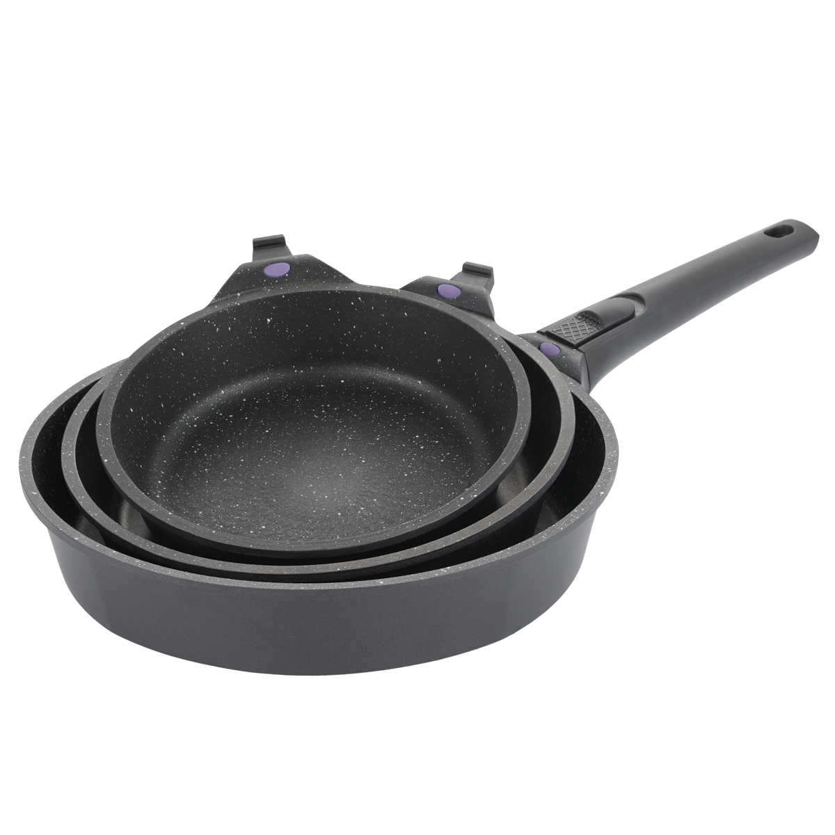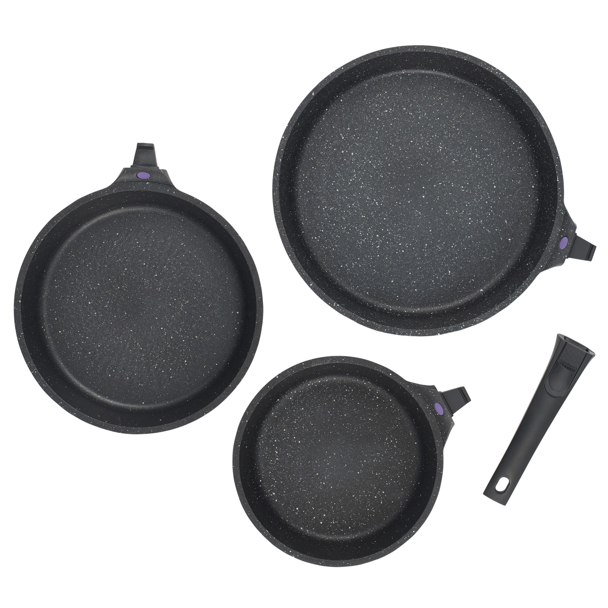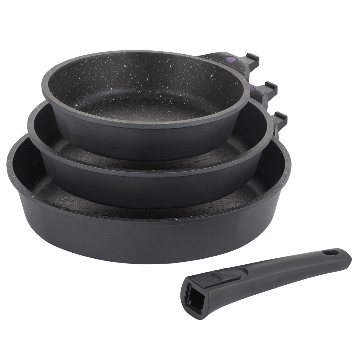 Набор cковород Gipfel Proofet 1480 4 предмета: сковорода 20 см, сковорода 24 см, сковорода 28 см и съемная ручка.