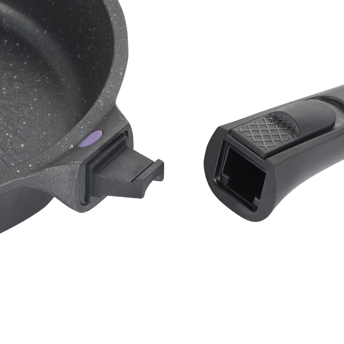 Съемная ручка из бакелита не нагревается в процессе приготовления, легко снимается нажатием пальца, и позволяет хранить сковороды, составив их одна в другую.