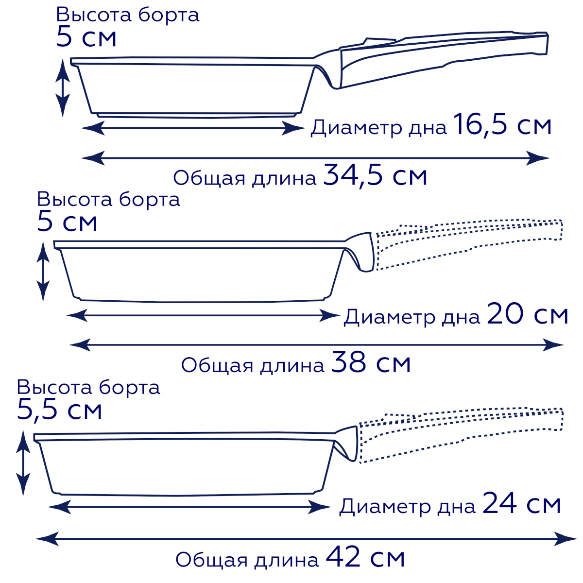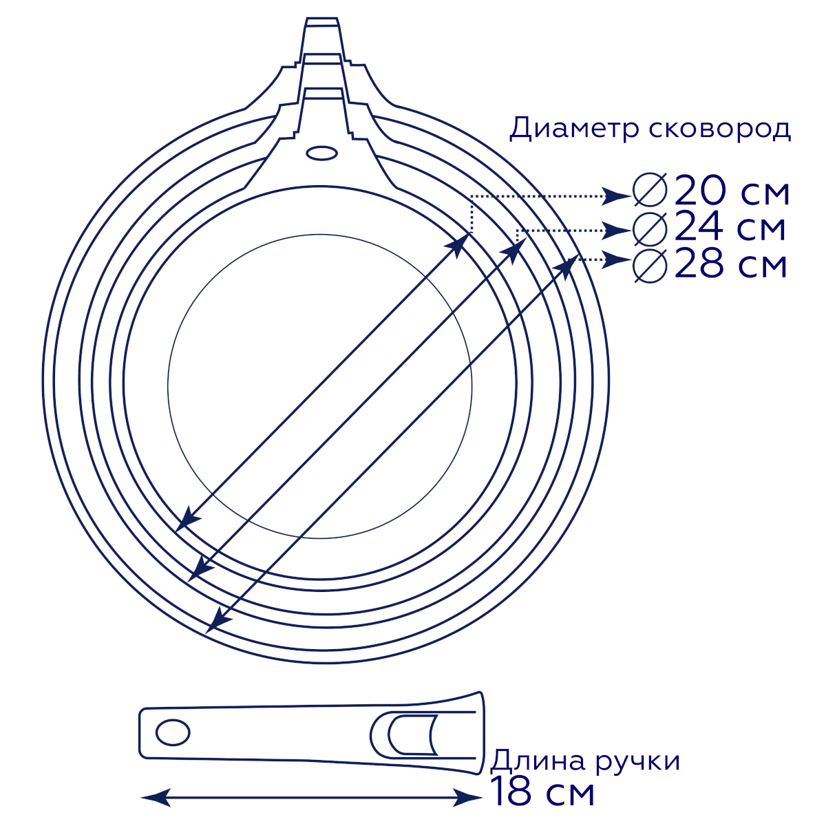 Диаметр сковород: 20 см, 24 см, 28 см. Диаметр дна сковород: 16,5 см, 20 см, 24 см.