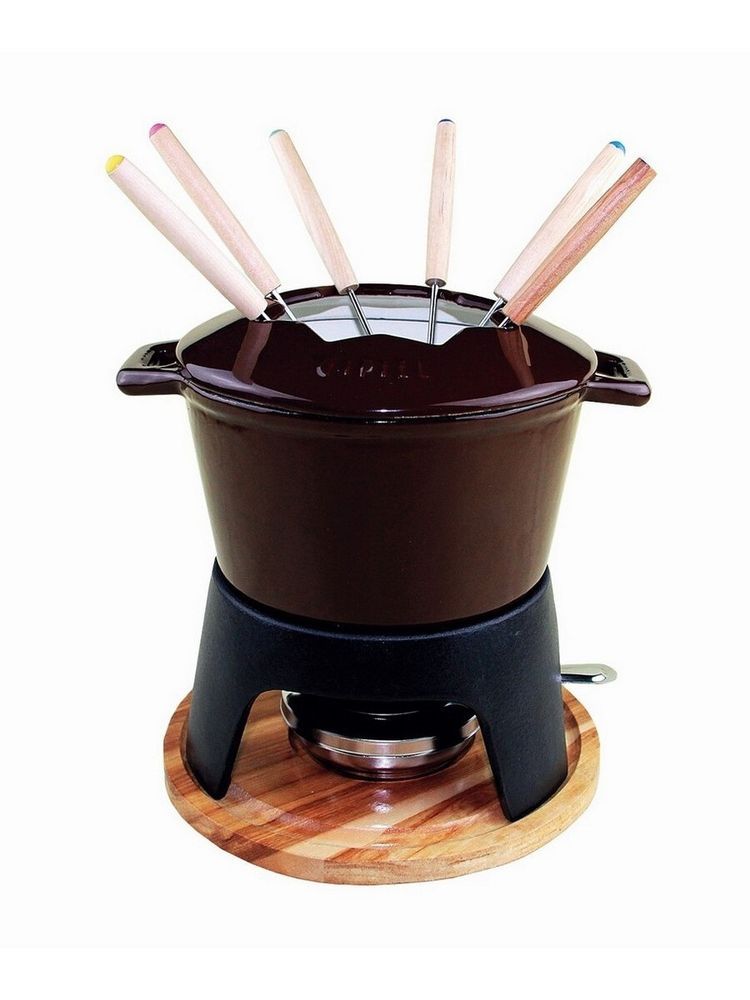 Модель, выполненная из чугуна, в течение продолжительного времени поддерживает температуру расплавленных продуктов. Жаростойкое керамическое покрытие не вызывает проблем с уходом, легко моется после использования. Посуда подогревается от свечи и используется как дома, так и на даче, однако при планировании транспортировки следует учитывать вес модели — 5 кг. В набор входят: чаша для сыра или шоколада; металлические шпажки с деревянной рукояткой, о которую невозможно обжечься; крышка из чугуна, сохраняющая нужную температуру внутри чаши.