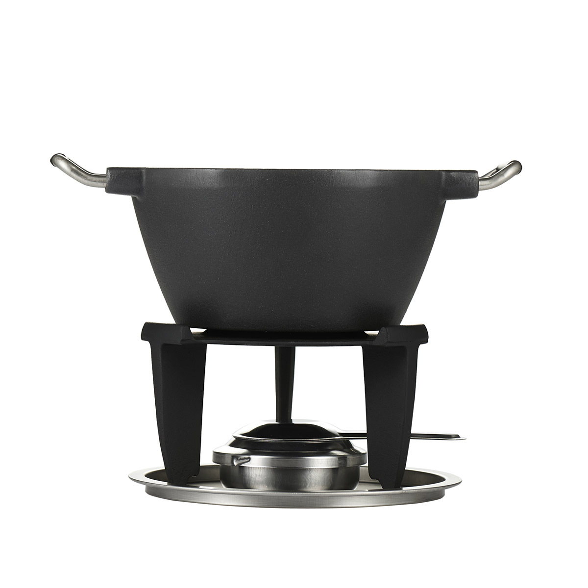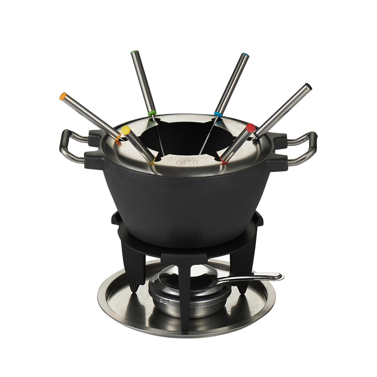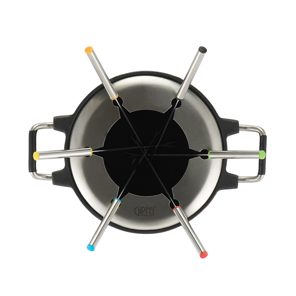 Набор для приготовления фондю Gipfel включает десять предметов и рассчитан на шесть человек. Форма для расплавки выполнена из чугуна — безопасного и долговечного материала, нагреваемого горелкой. Мощности хватает, чтобы приготовить швейцарское или французское фондю на основе различных продуктов, в котором моментально провариваются небольшие кусочки мяса. Как и другая посуда торговой марки, фондю Гипфел не требует сложного ухода. Используется на природе, на даче, дома. Такая модель станет подарком для гурмана, а ее приобретение не ударит по бюджету.