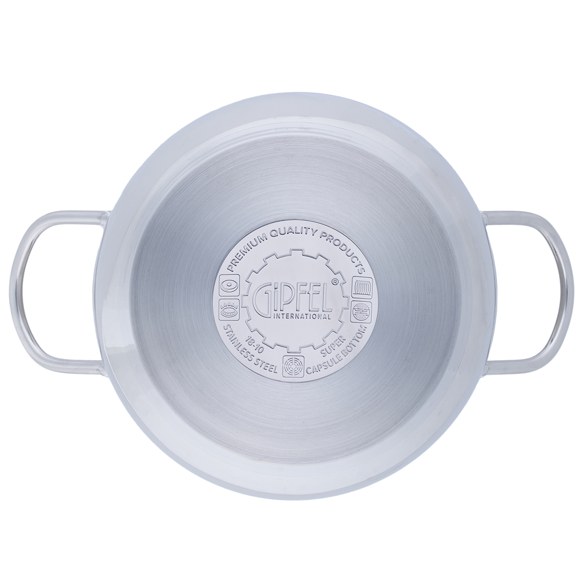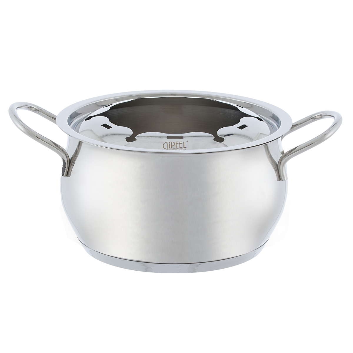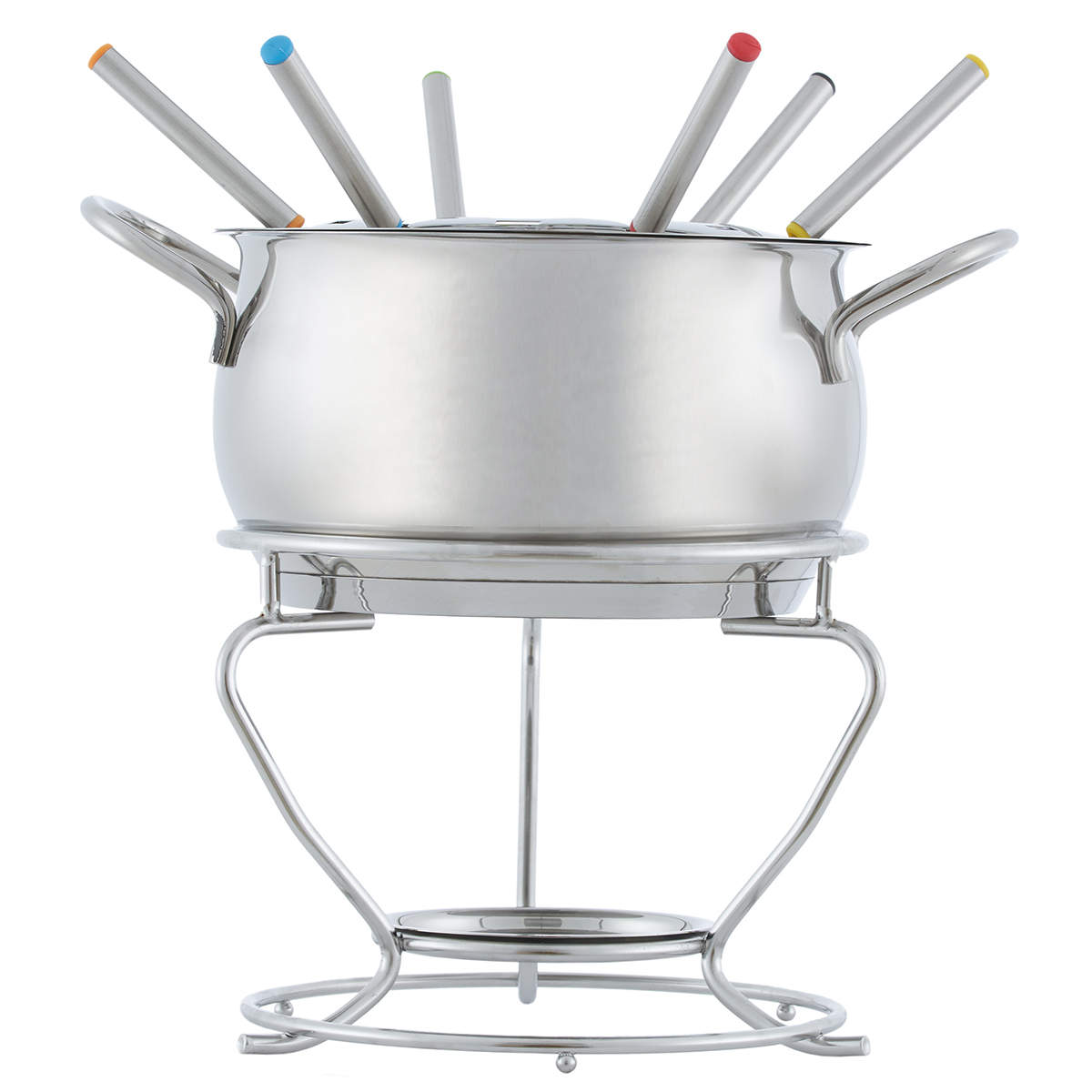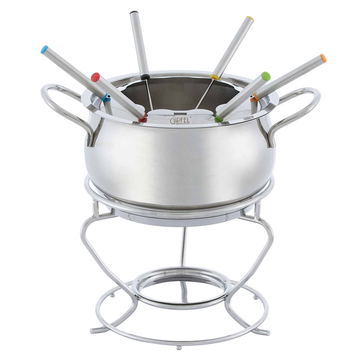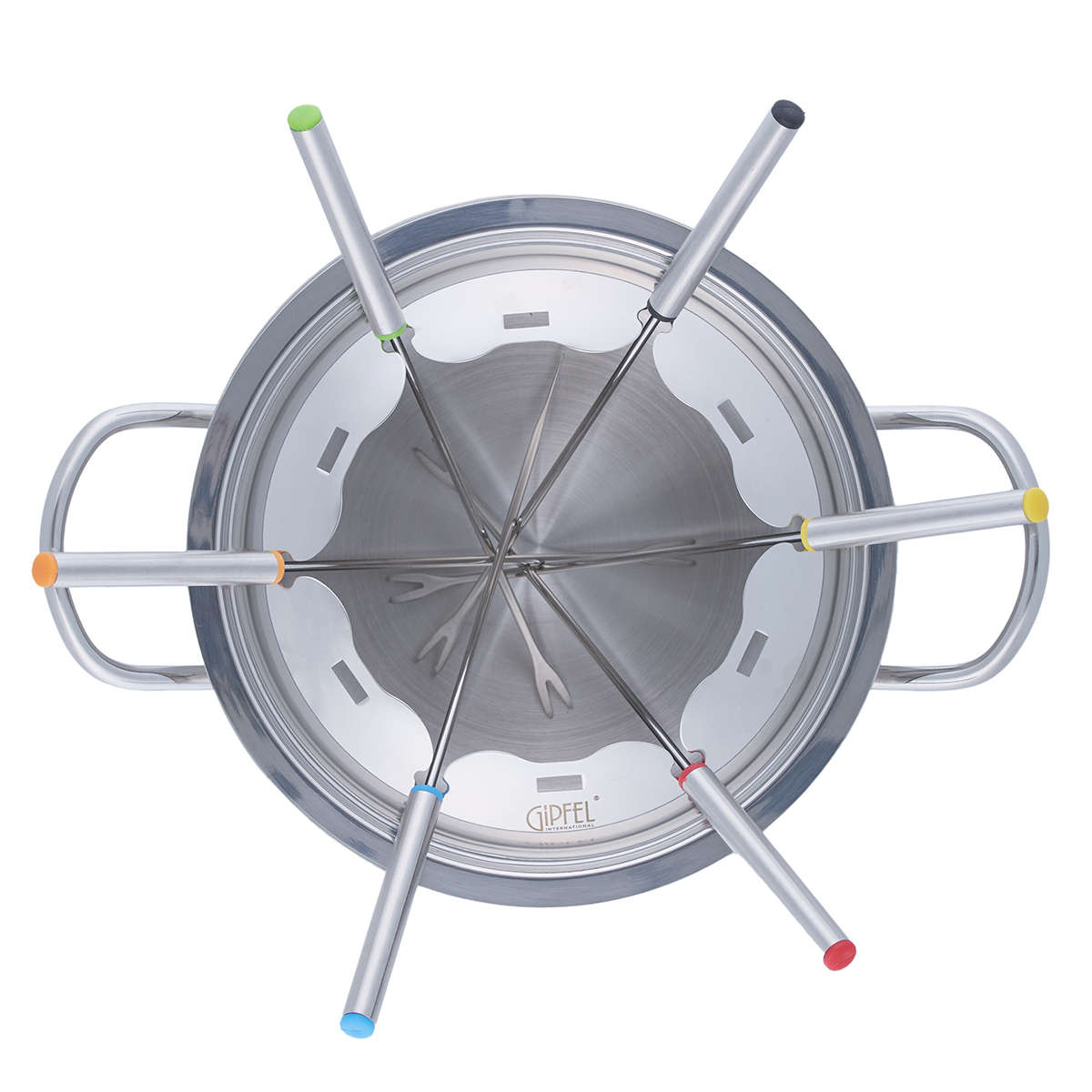 Набор для фондю Gipfel Gruyere 52435 9 предметов: 6 шпажек длиной 23 см, чаша 28х11 см, 2,5 л, подставка под чашу, кольцо для шпажек. Материал: нержавеющая сталь 18/10. Толщина стенок: 0,6 мм.