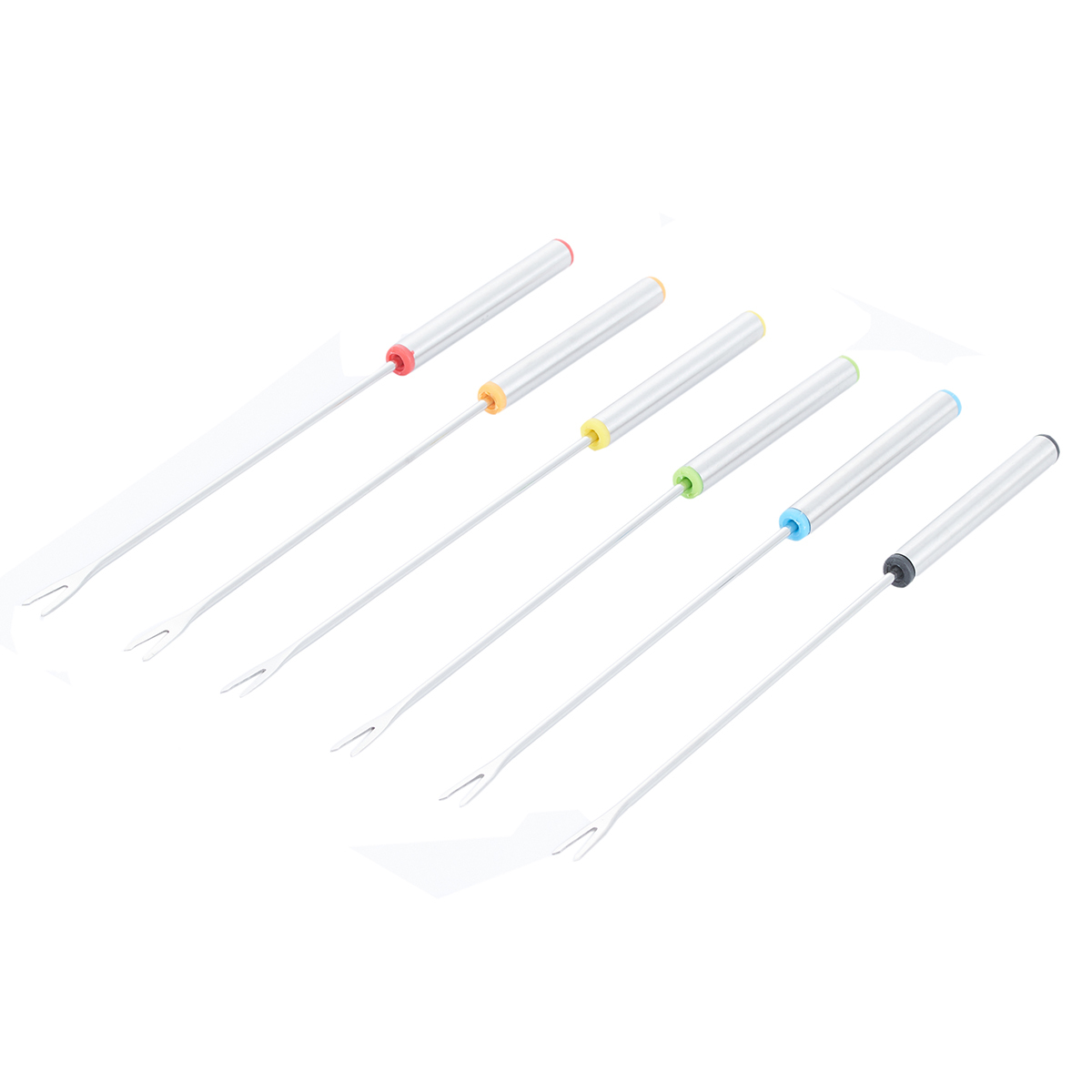 Вилки удобны в использовании. Наконечники окрашены в разные цвета, что позволит гостям не перепутать свою с чужой.