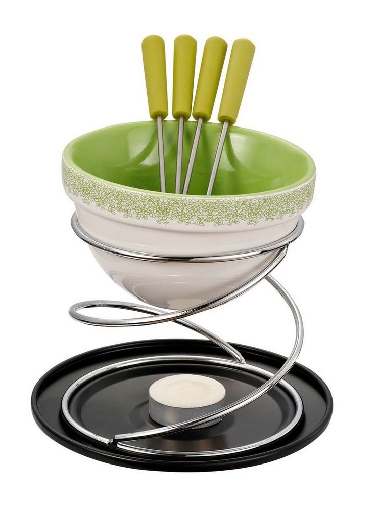 Набор для приготовления шоколадного фондю Gipfel MINOR 1903. Размер набора 15х13 см. Объем емкости для фондю составляет 350 мл. Емкость выполнена из керамики снаружи бежевого, а внутри зеленого цвета. В наборе 4 вилки с зелеными ручками. Хромированная подставка представляет собой переплетение стальных прутьев, куда вставляется керамическая емкость. Конструкция устанавливается на круглый металлический поднос, на котором можно разместить свечу для подогрева.