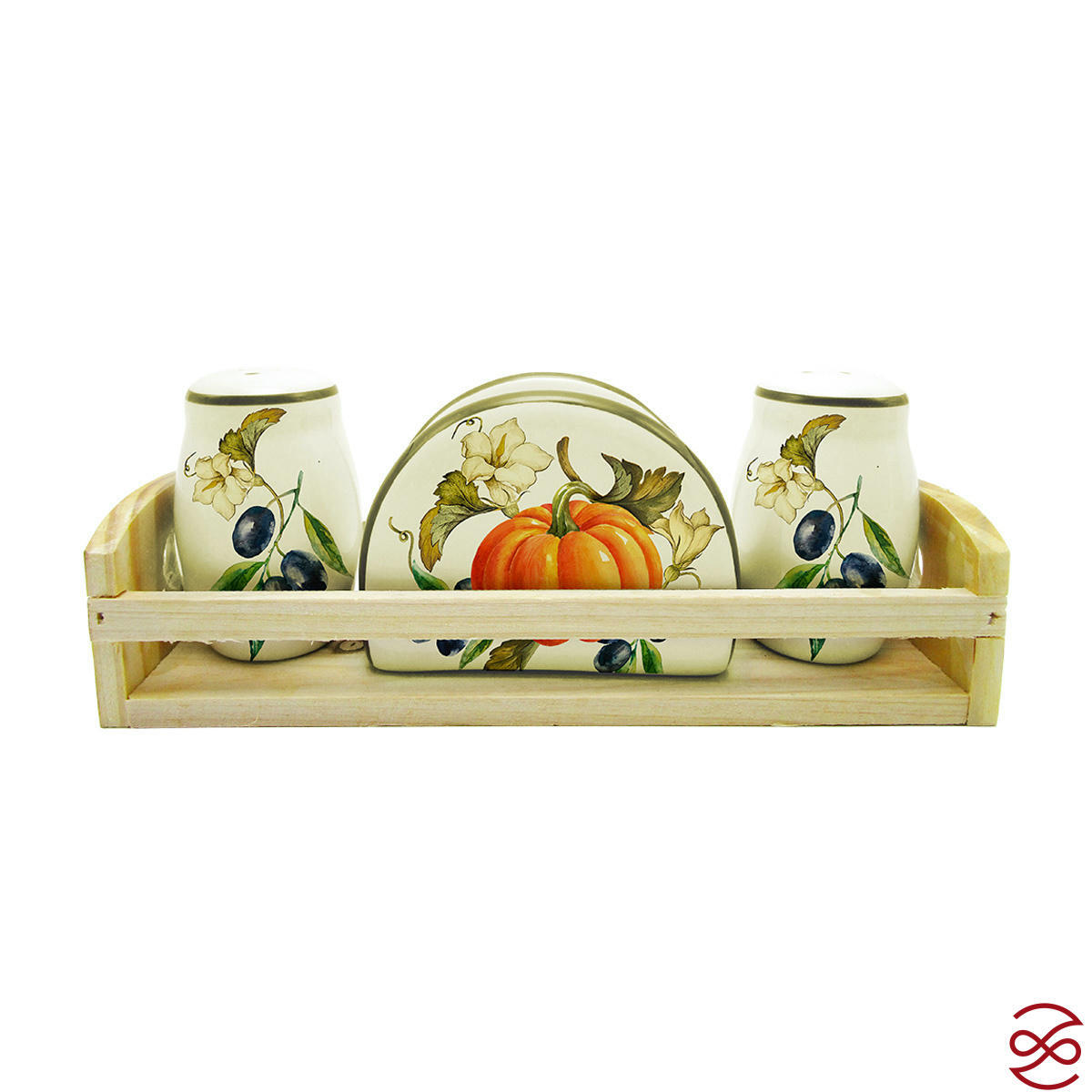 Элегантный штрих сервировки стола в новом формате! Атмосферные приборы для специй и салфетница из керамики на деревянной подставке с декором из сочных тыкв станет ярким акцентом убранства стола и незаменимым помощником на каждой кухне. Ведь известно, что благодаря специям, блюда приобретают неповторимый привкус и аромат. Пусть этот набор для сервировки будет вашим маленьким секретом в приготовлении аппетитных угощений и их оригинальной подачи.
