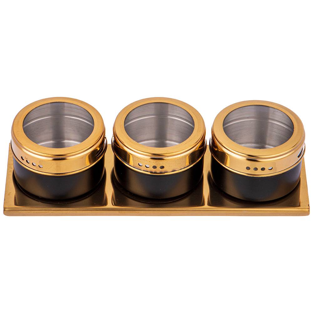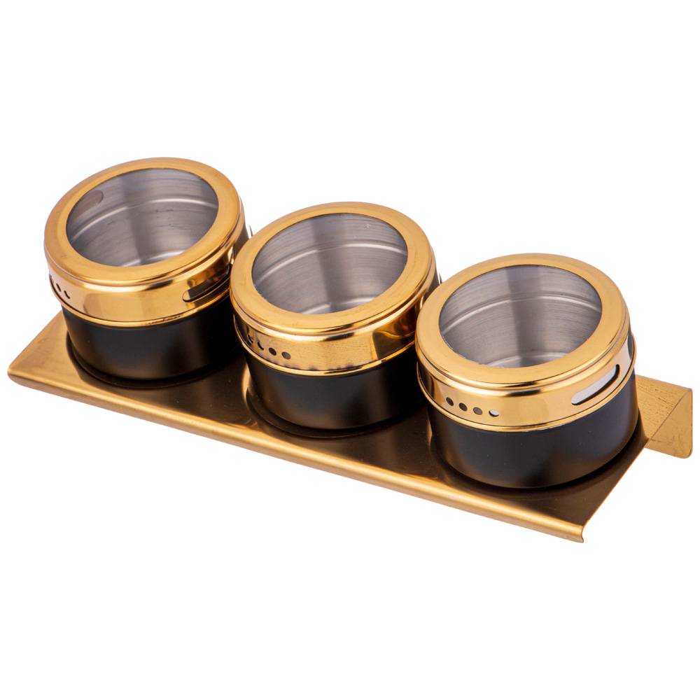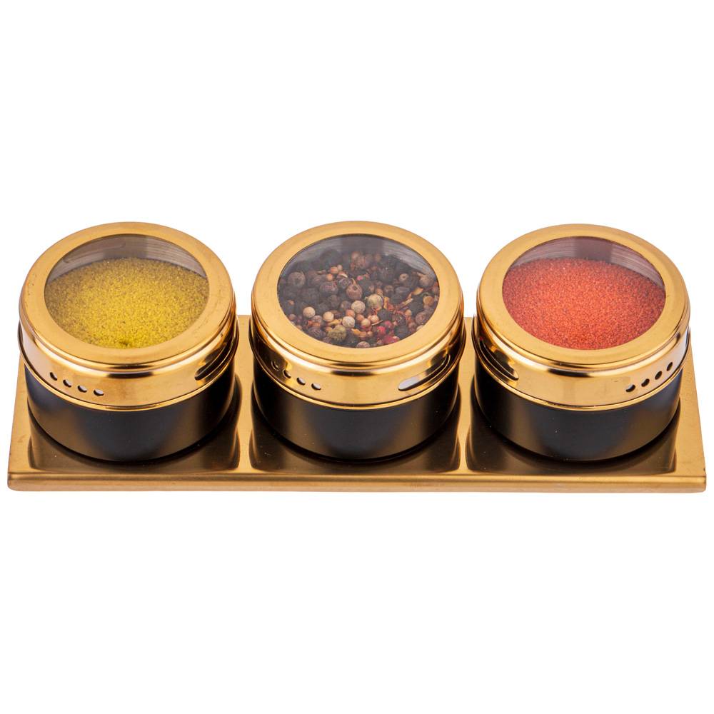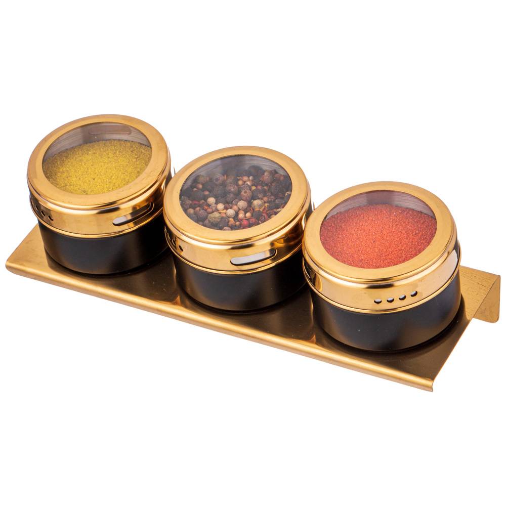 Каждая емкость для специй оснащена магнитом, вмонированным в дно, что позволяет при необходимости закрепить ее на любой другой металлической поверхности, например, дверце холодильника или металлической вытяжке над плитой.