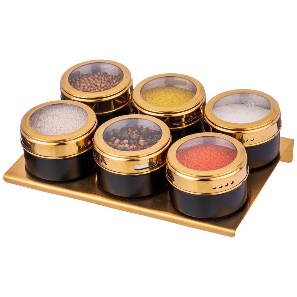 Каждая емкость для специй оснащена магнитом, вмонированным в дно, что позволяет при необходимости закрепить ее на любой другой металлической поверхности, например, дверце холодильника или металлической вытяжке над плитой.