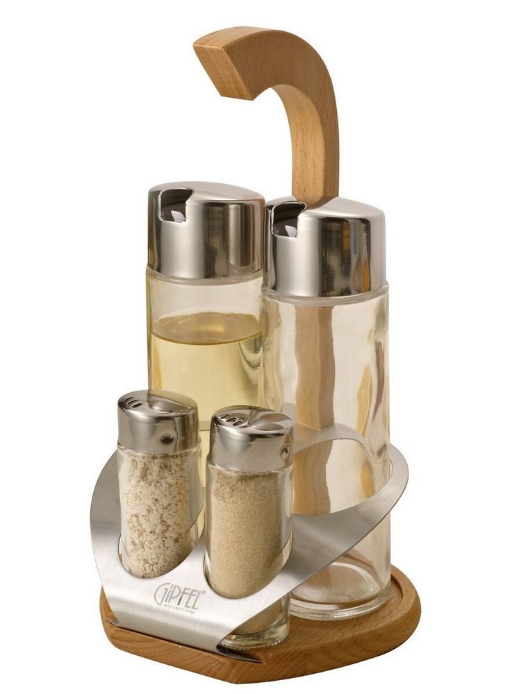 Набор для специй Gipfel Icum 9094. В наборе 4 стеклянных предмета на подставке: солонка 75 мл, перечница 75 мл, бутылочка для масла 250 мл, бутылочка для уксуса 250 мл. Подставка оснащена ручкой для переноски, на корпусе фирменный логотип Gipfel. Подставка выполнена из натурального бамбука. Размер набора 13,4х11,4х23,4 см, он не займет много места на сервированном столе и позволит хранить приправы и специи в одном месте.