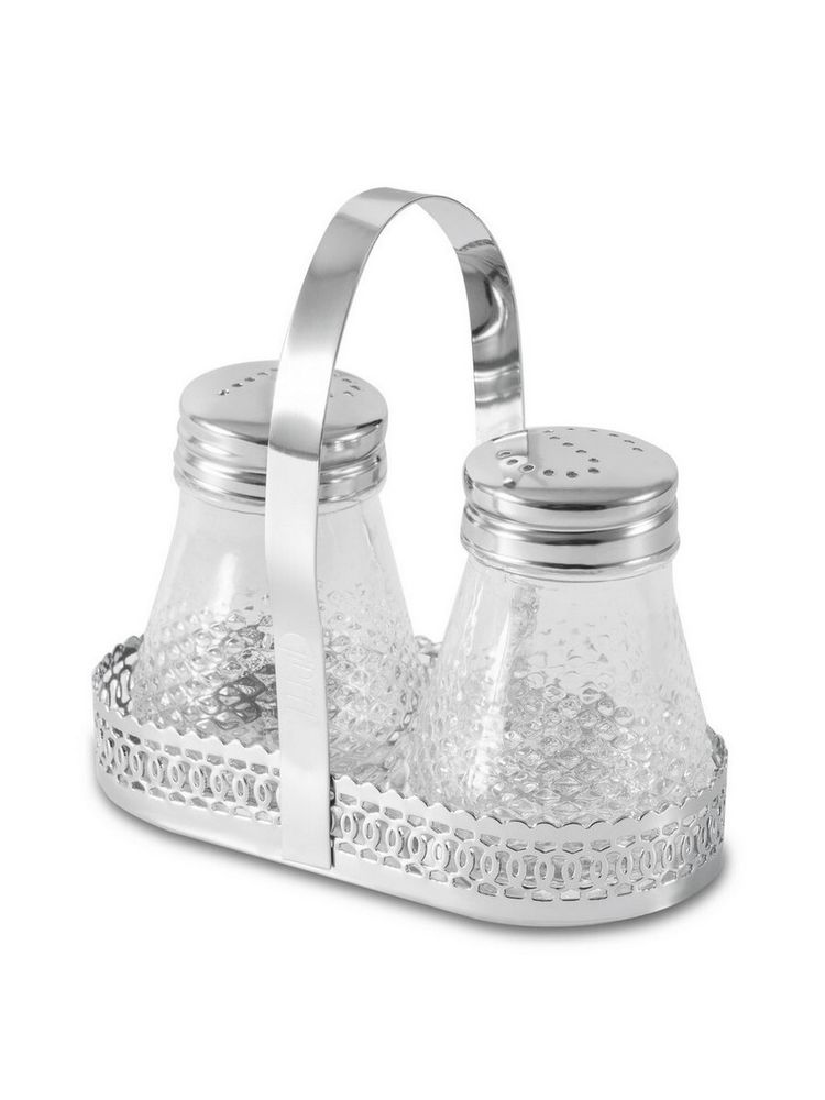 - 3 предмета- размеры 10,5х5х10,5 см- стеклянные солонка, перечница- стальная подставка