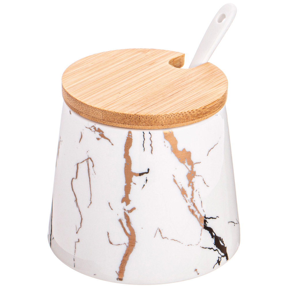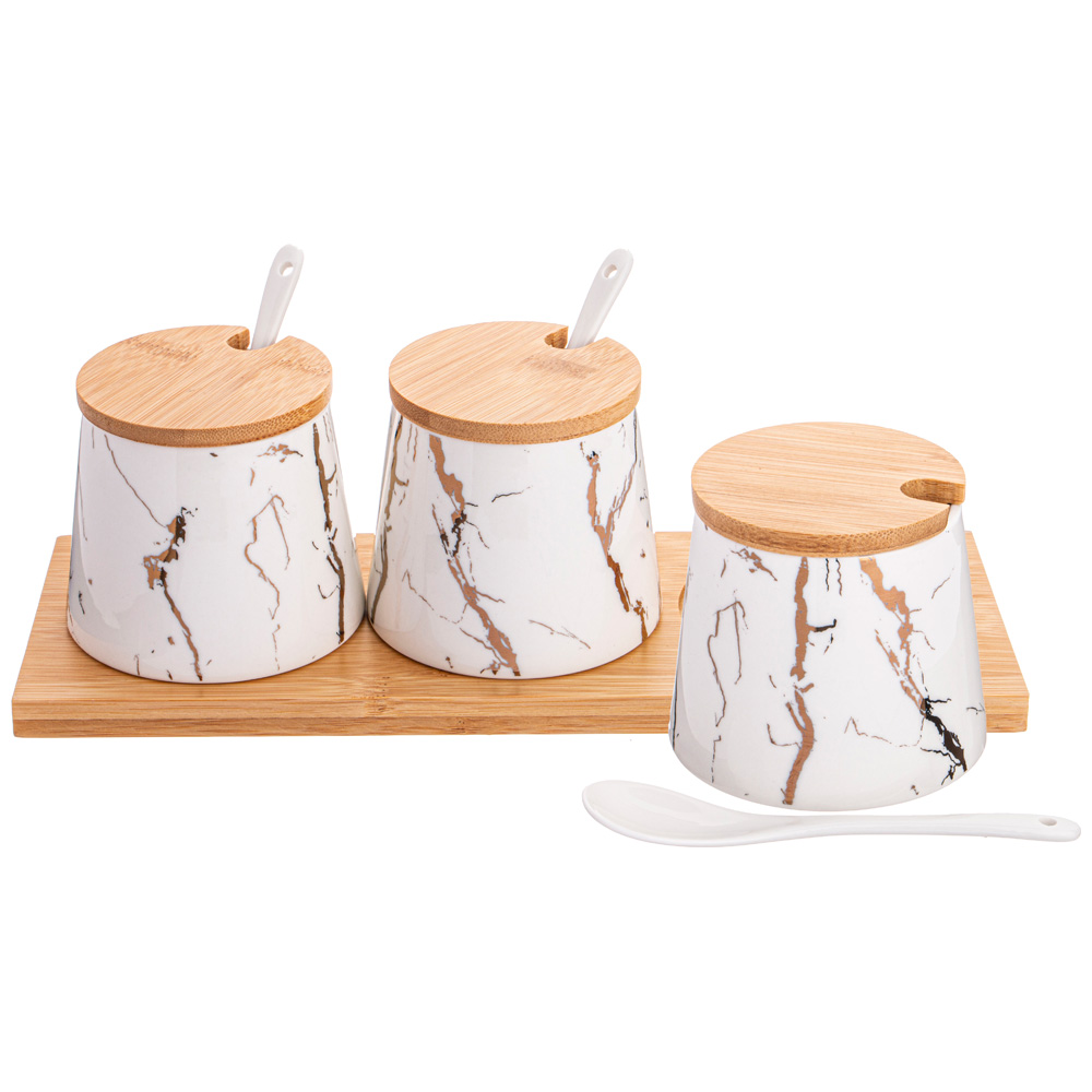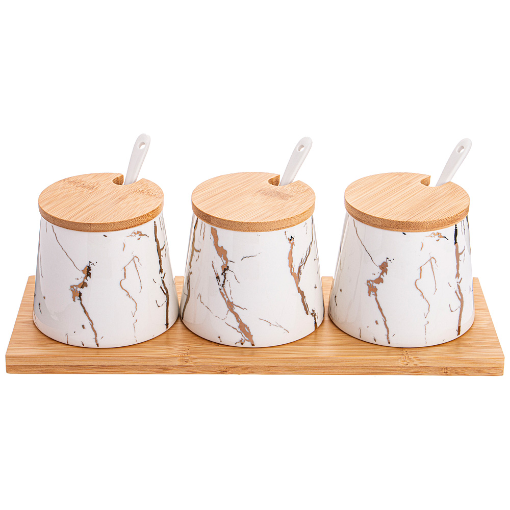 Коллекция "Fantasy" ТМ LEFARD - это модная сервировка стола и стильный кухонный интерьер в классическом белом с золотом цвете. Блюда и формы различных размеров, менажницы на бамбуковых подставках, банки, тарелки и салатники различного назначения, чайники, чайные пары и кружки выполнены из упрочненного фарфора. Четкие линии, сверкающее глянцевое покрытие. Вы и Ваш стол неотразим! Посуда прошла сертификацию. Безопасна для контакта с пищевыми продуктами. Можно использовать в микроволновой печи. Не рекомендуется мыть в посудомоечной машине. Комплектность: банка с крышкой 280 мл - 3 шт, ложка фарфоровая - 3 шт, подставка деревянная 28*10*8,5 см - 1 шт.