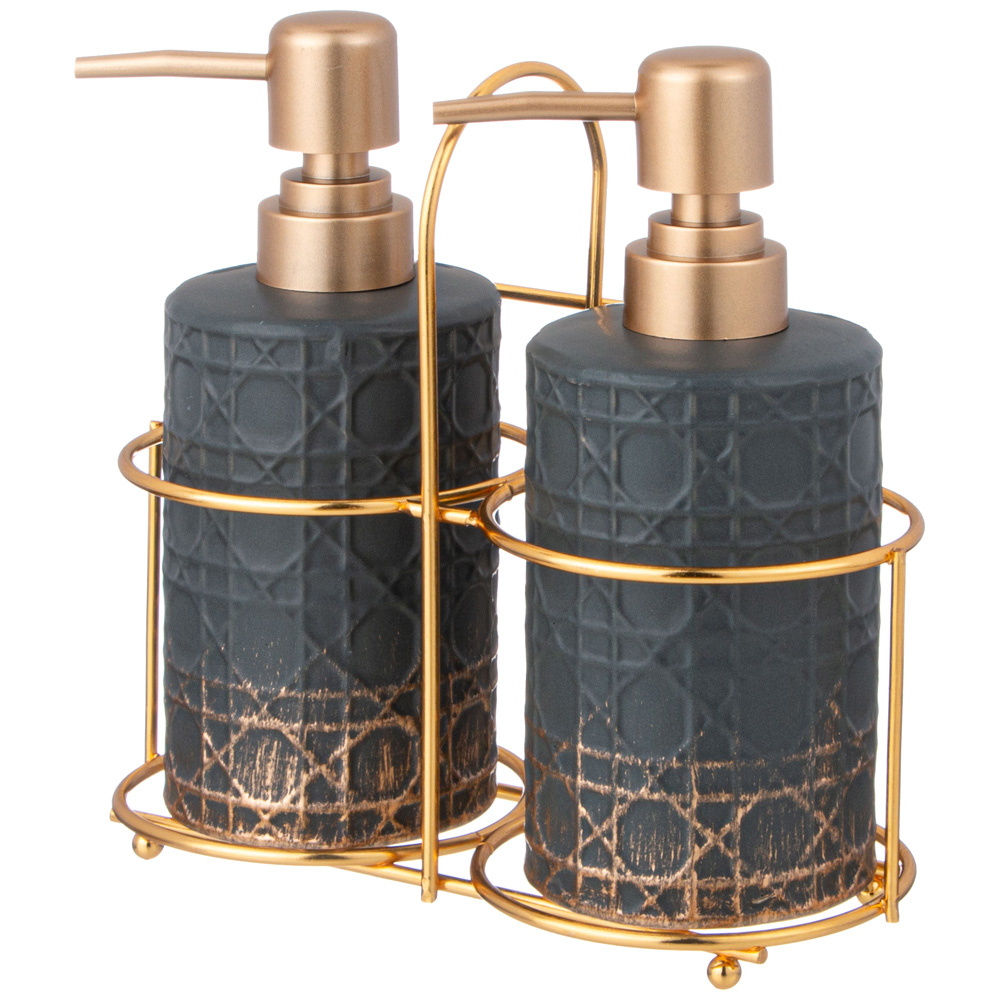 Секрет удачного оформления любого интерьера — яркие аксессуары! Дозатор для ванной не только внесёт изюминку в интерьер, но и придаст ему стильность, уют и ощущение завершенности. В комплект входят 2 дозатора для жидкого моющего средства и подставка.