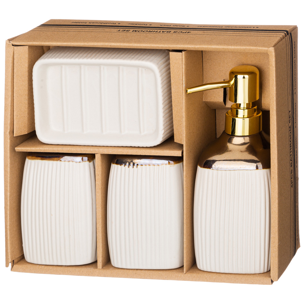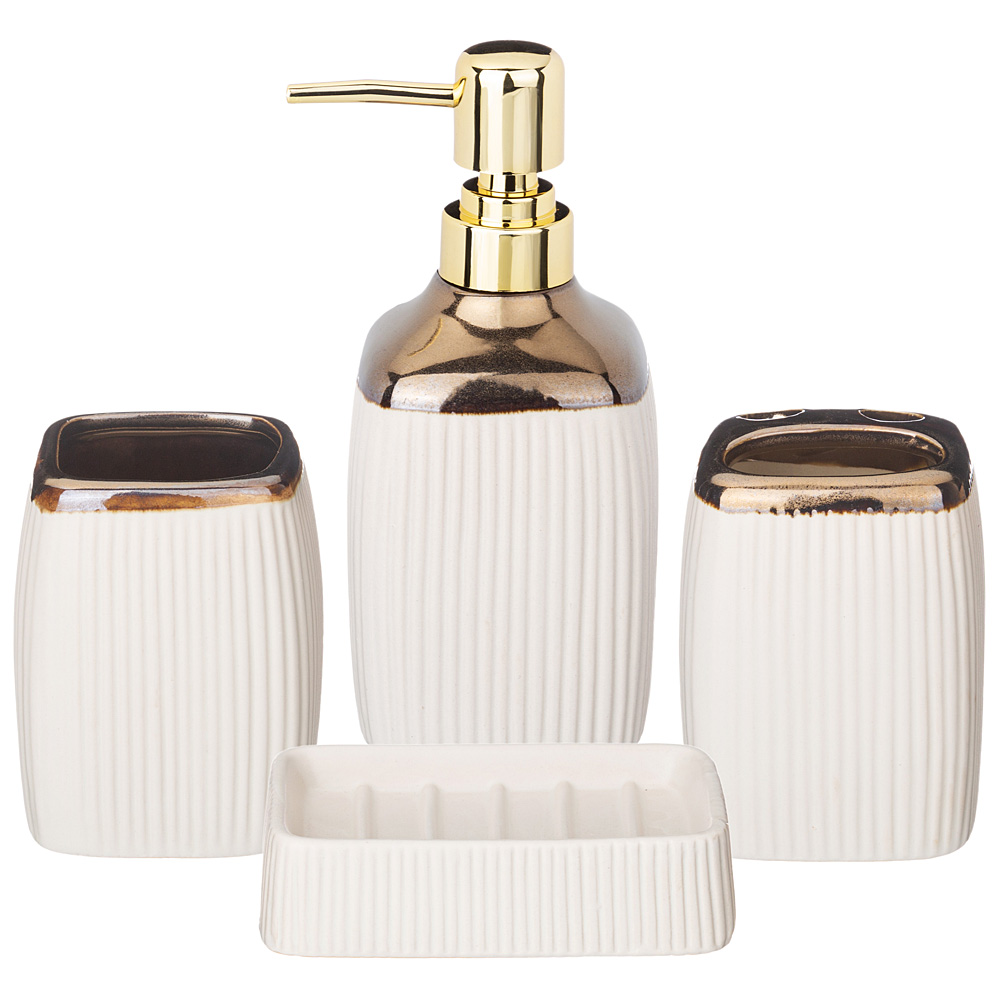 Набор аксессуаров для ванной комнаты состоит из дозатора для жидкого мыла, подставки-стакана, подставки для зубных щёток и мыльницы для кускового мыла.