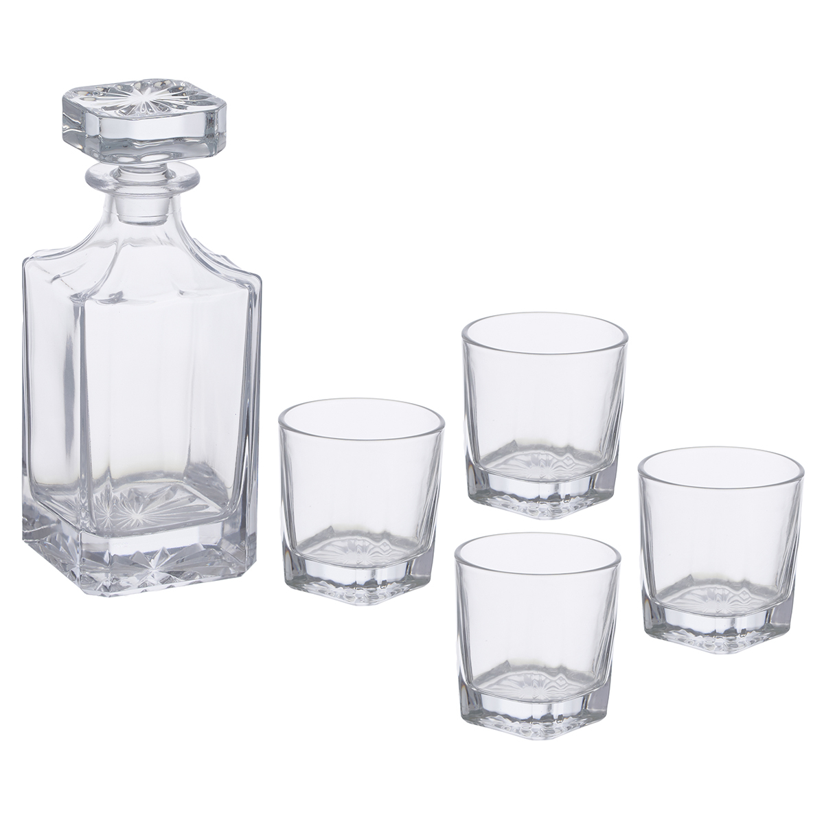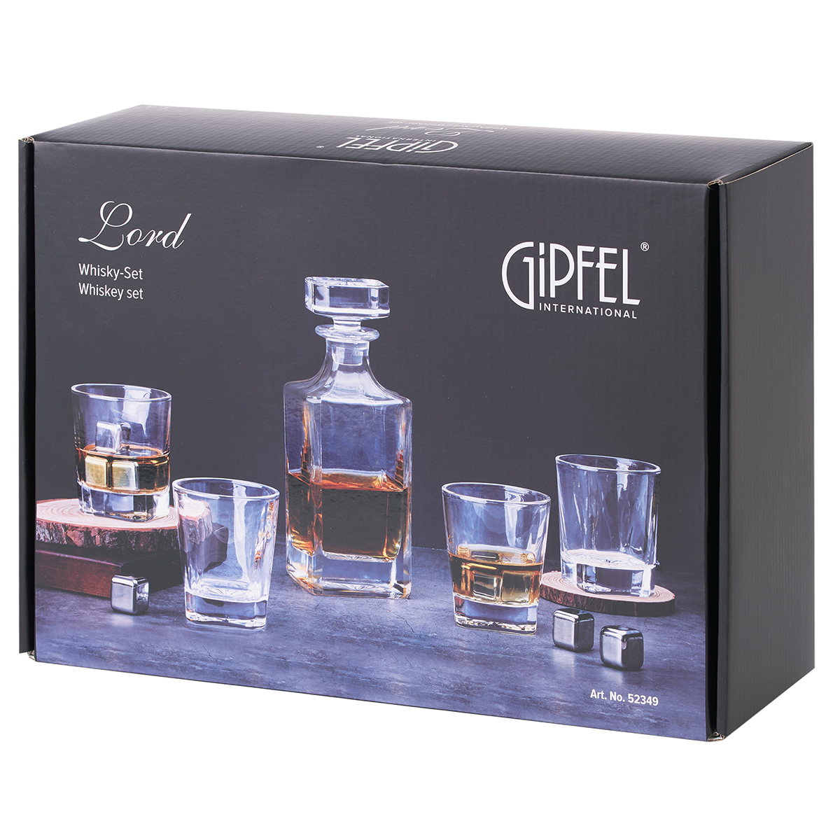 Набор для виски Gipfel Lord 52349 5 предметов: графин 700 мл, 4 бокала 320 мл. Бокал: вес - 413 г, размер - 9x9 см, размер дна - 6,5x6,5 см; графин: вес - 1366 г, высота - 22 см, размер дна - 9x9 см, диаметр горлышка - 3 см, размер пробки - 6x6 см.