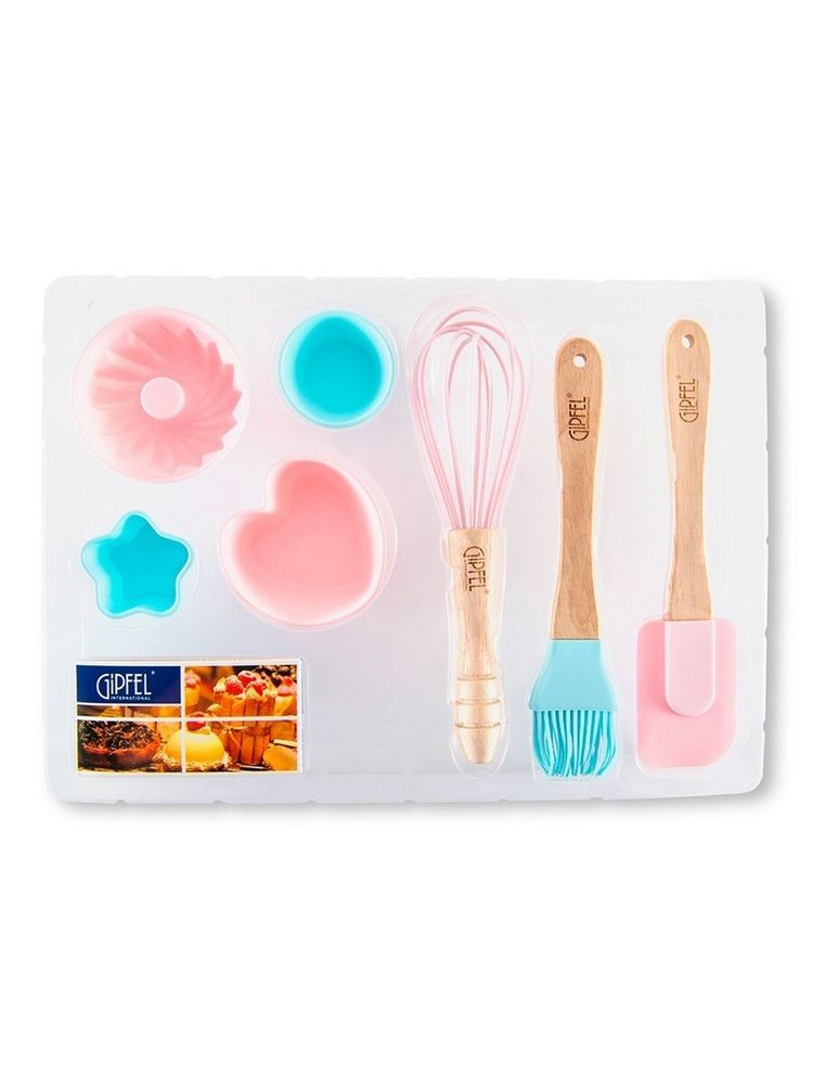 Незаменимый кулинарный набор GIPFEL для сладких изделий комплектуется семью предметами: лопатка из силикона, венчик, кулинарная кисть и четыре формочки, изготовленных из пищевого силикона и натурального дерева. Силикон не окисляется при сильном нагревании, вредные вещества не выделяются. Лопатка и венчик оснащены прочными ручками из древесины с полированной поверхностью. Чудесный подарок для повара и украшение на кухню.