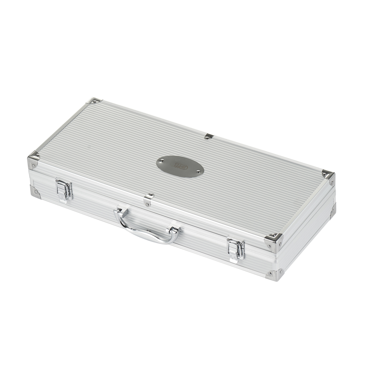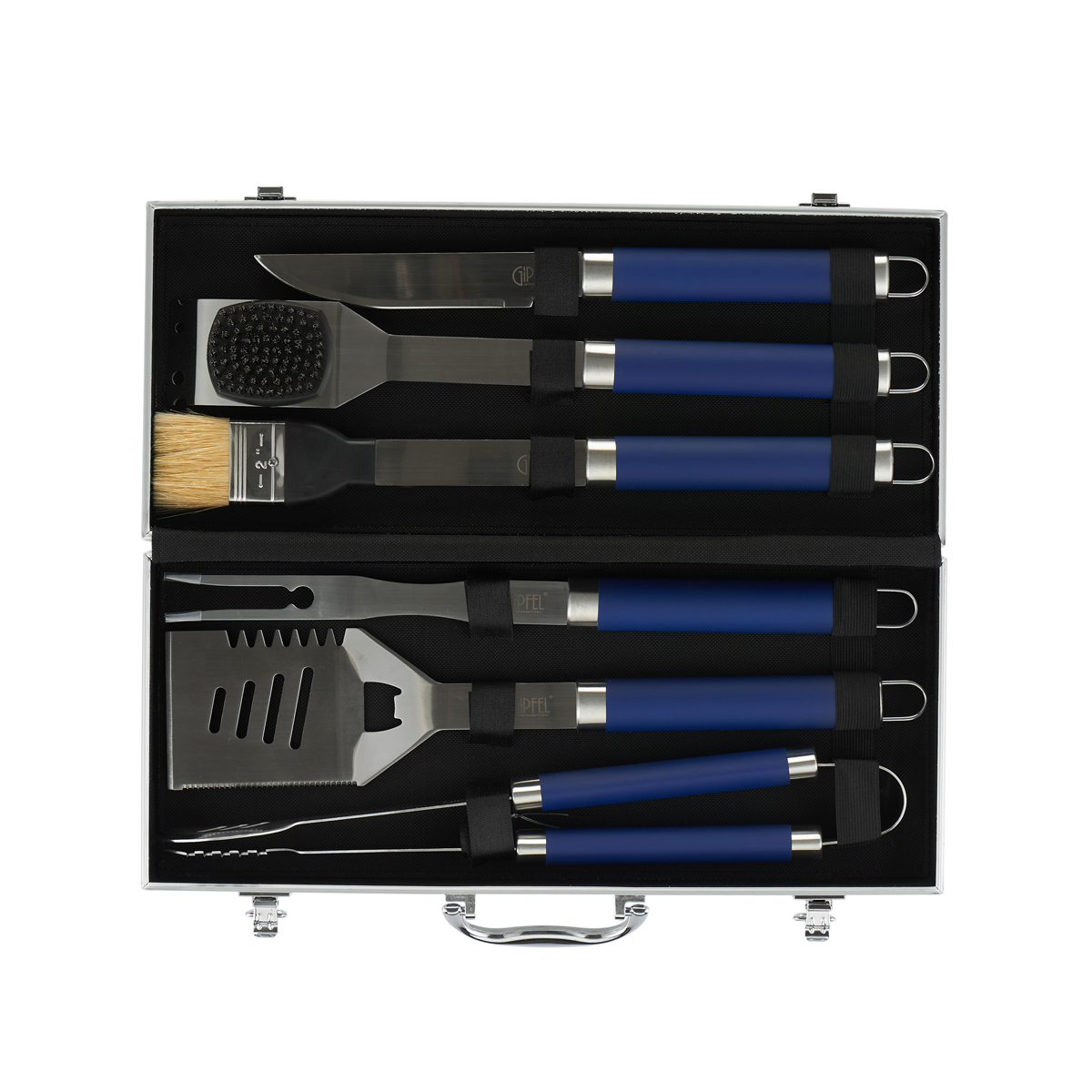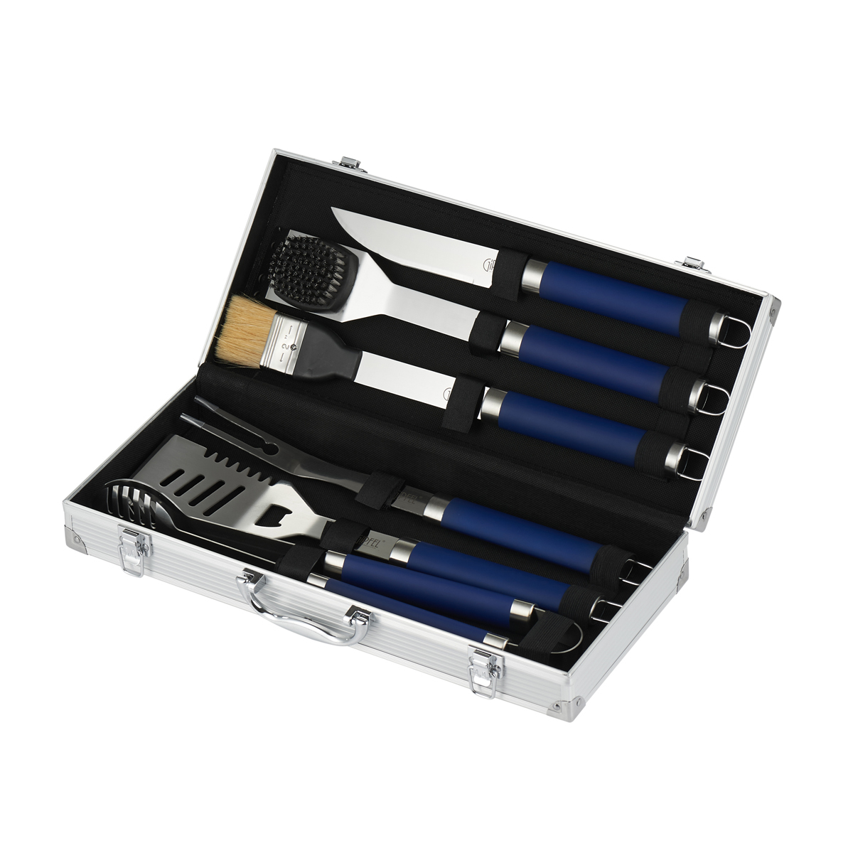 Набор для барбекю Gipfel Auriga 5938. В наборе 6 инструментов для барбекю: нож 38 см, шпатель 43 см, щипцы 42 см, вилка для мяса 42 см, кисть 44 см, щетка стальная 43 см. Набор упакован в алюминиевый кейс с ручкой для удобства переноски. Все инструменты надежно закреплены фиксаторами на липучке. Рабочая часть аксессуаров сделана из нержавеющей стали, ручки резиновые.