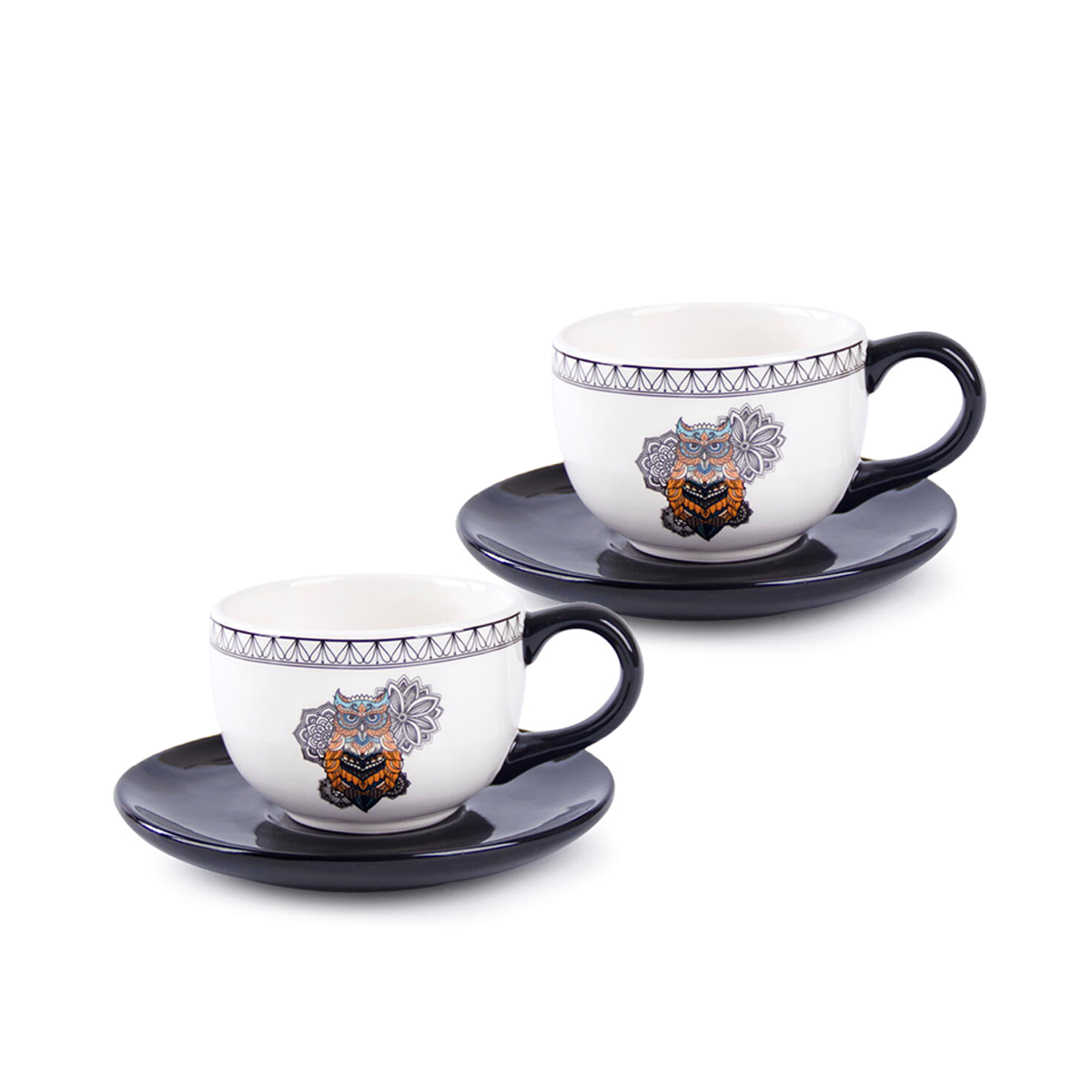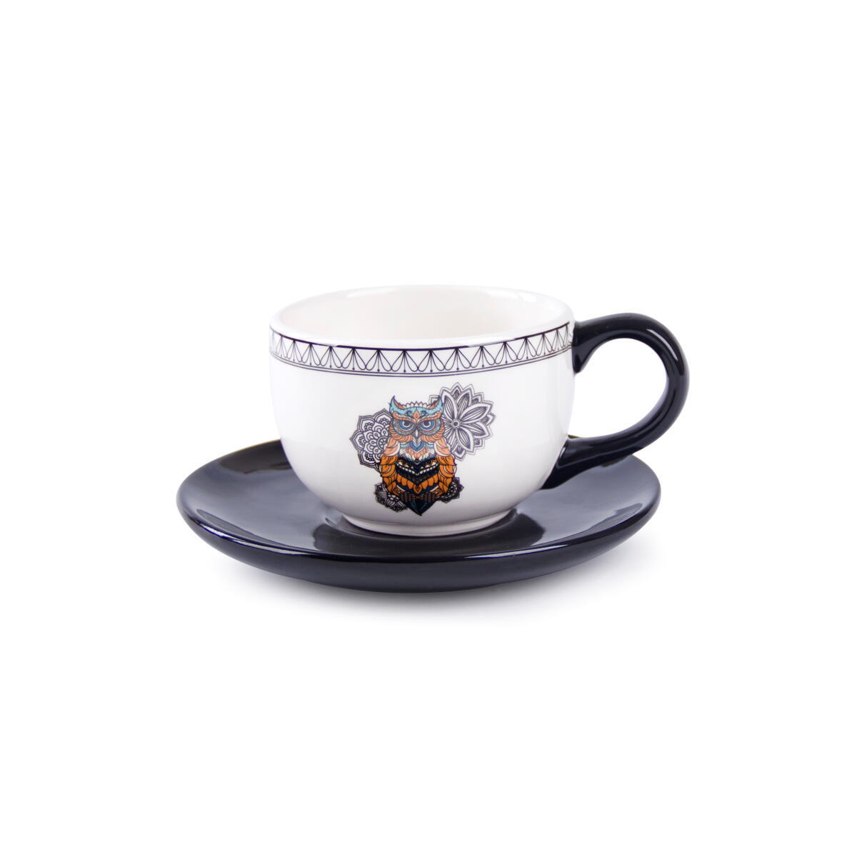 Чайный набор из 4 предметов GIPFEL CIVETTA 3964. В наборе 2 чашки с рисунком объемом 300 мл и 2 черных глянцевых блюдца диаметром 15 см. Набор сделан из толстой керамики и рассчитан на 2 персоны. Чашки с изображением совы и орнаментом по краю смотрятся эффектно и сочетаются с другими товарами для сервировки коллекции CIVETTA.