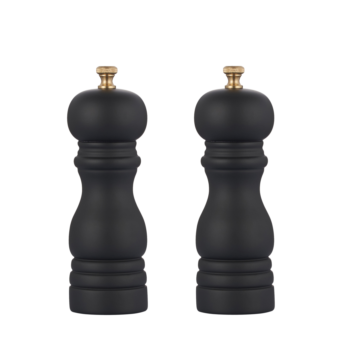 Набор из двух мельниц для перца и соли Gipfel BORDO 50951. Мельницы высотой 15 см. Набор выполнен из натурального каучукового дерева с элементами из алюминия и нержавеющей стали. В мельнице для перца жернова сделаны из углеродистой стали, в мельнице для соли - из керамики. Мельницы имеют маркировку с буквами: "S" для соли и "P" для перца. Выполнены в классическом стиле с резьбой по окружности и имеют матовый черный цвет.