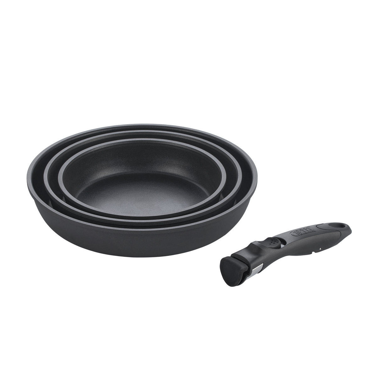 В набор входят 3 сковороды (20х4,5 см, 24х5 см, 28х5,3 см) а также съемная ручка. У сковород двухслойное антипригарное покрытие Whitford Xylan Plus. Сковороды многофункциональны, так как со снятой ручкой они превращаются в формы для запекания в духовке: в них можно готовить овощные запеканки, томить мясо или выпекать бисквит.