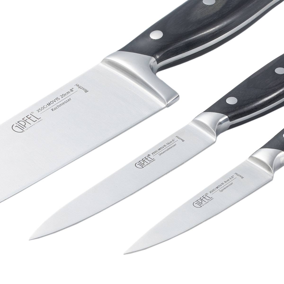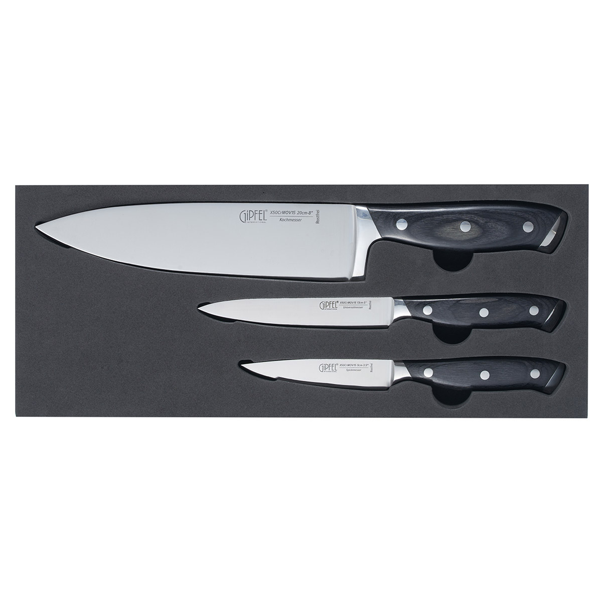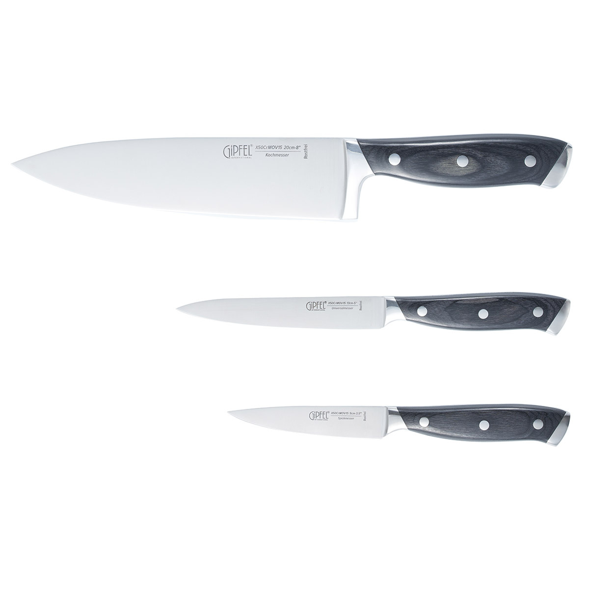 Набор из 3 ножей Gipfel Vilmarin 51809: нож поварской 20 см, универсальный нож 12,7 см, нож для чистки овощей 9 см. Материал лезвия: сталь X50CrMoV15. Ручка: сталь, древеснослоистый пластик.