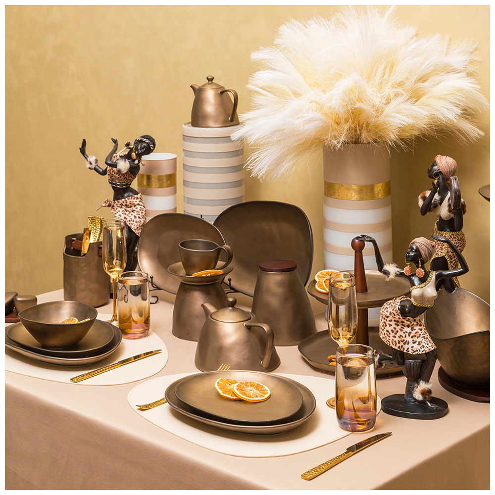 ТМ BRONCO коллекция BRONZE – это ультрамодная посуда из упрочненного фарфора для сервировки стола с элементами из темного бамбука. Для достижения эффекта состаренной античной бронзы используется матовая глазурь темного бронзового цвета. Смелое сочетание современных форм и матовой бронзы креативно и подчеркнет стиль и вкус хозяйки. Коллекция представлена обеденными и закусочными тарелками, салатниками и блюдами разных форм и размеров, посудой для чая и кофе, сервировочными наборами и подставками. Легко накрыть изысканный незабываемый стол. Продукция сертифицирована. Безопасна для контакта с пищевыми продуктами. Фарфоровые изделия можно использовать в микроволновой печи, мыть в посудомоечной машине с применением мягких неабразивных средств.