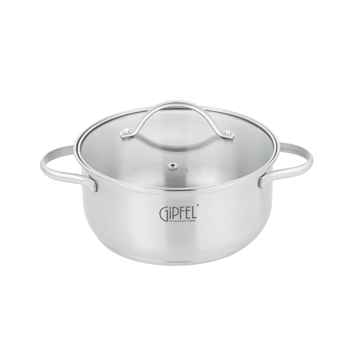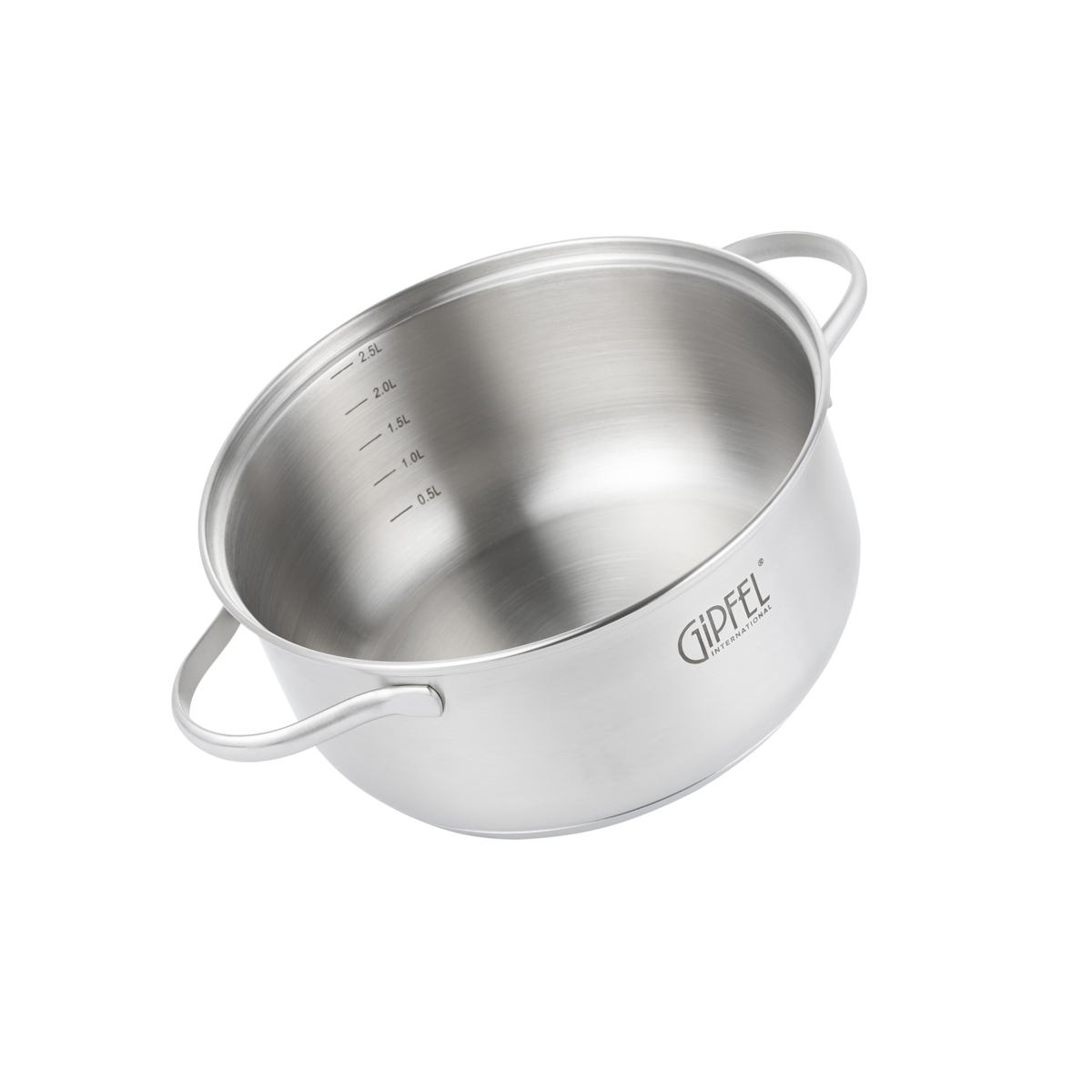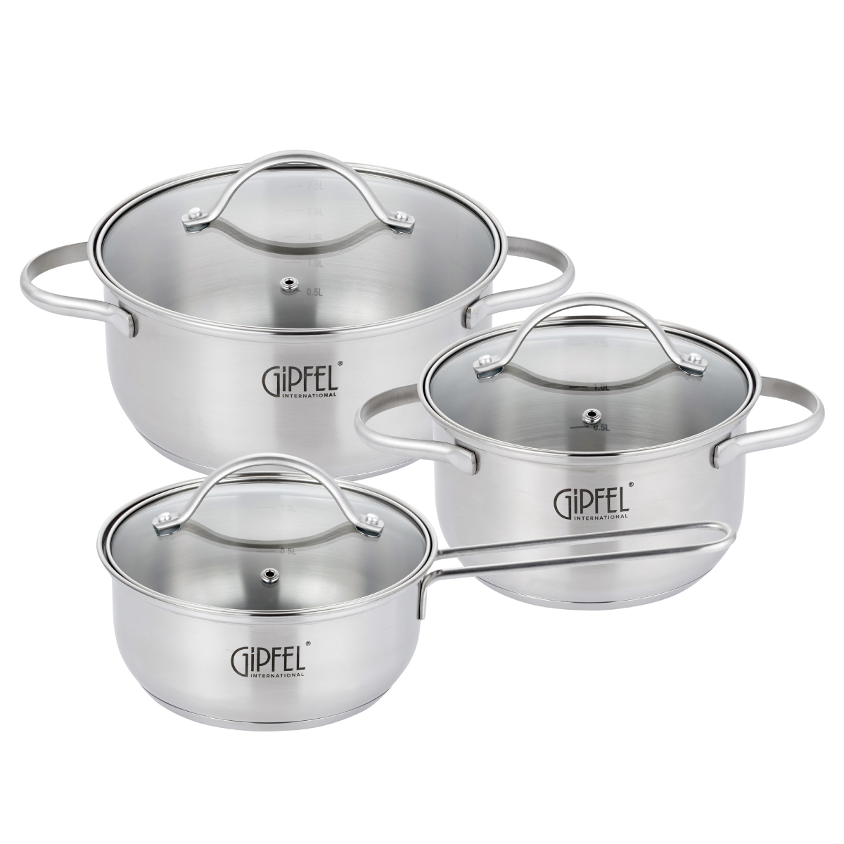 Набор кастрюль Gipfel Azalea 51061 из 6 предметов. Набор включает: ковш 16х7,5 см/ 1,1 л, кастрюля 16х9,5 см/ 1,4 л, кастрюля 20х9,5 см/ 2,3 л. Кастрюли и ковш со стеклянной крышкой, с индукционным капсульным дном. Материал: нержавеющая сталь 18/10. Толщина стенок 0,5 мм.
