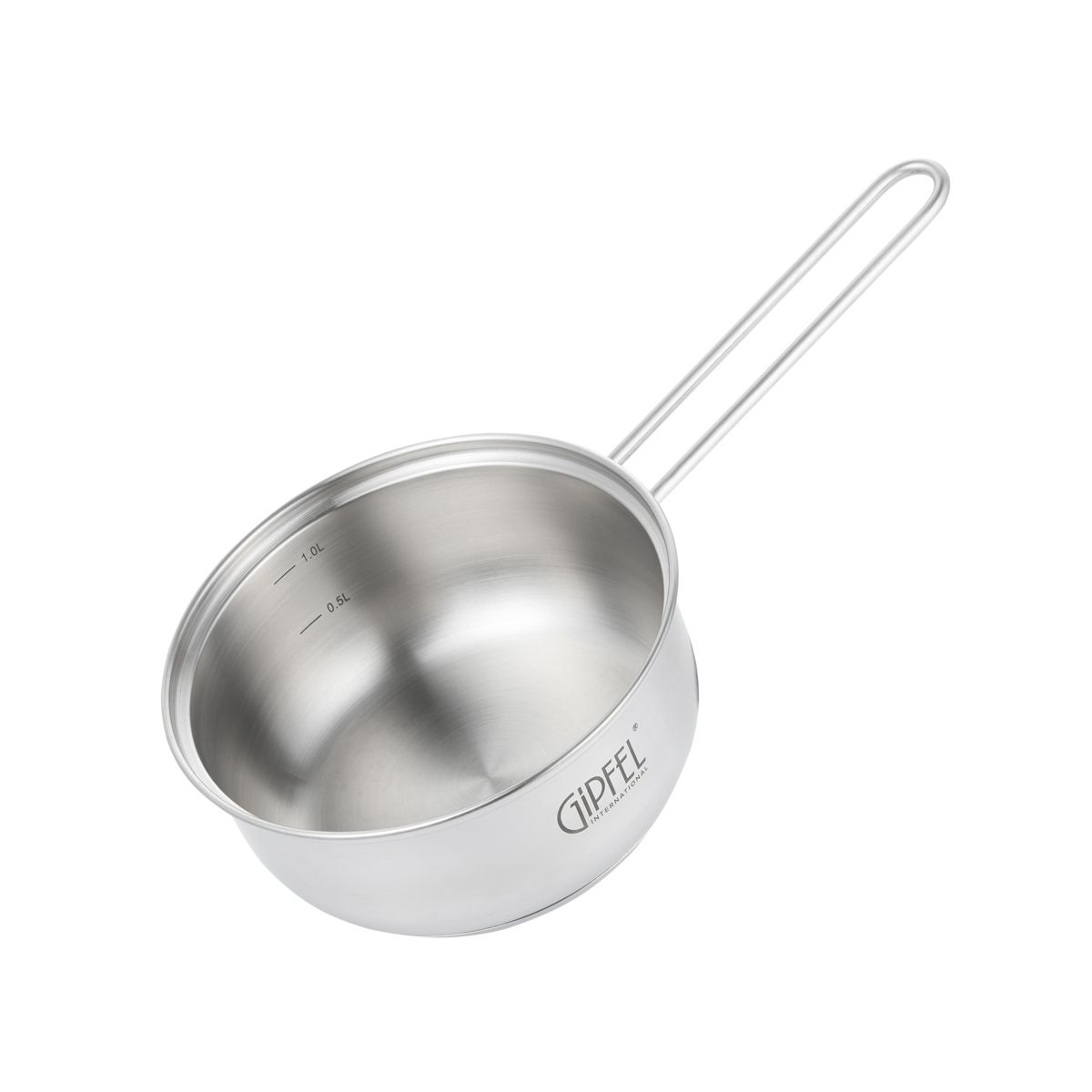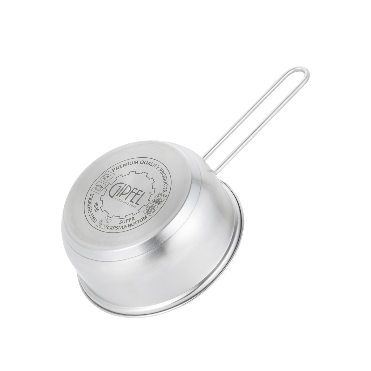 У кастрюль и ковша индукционное капсульное дно. При приготовлении пища нагревается равномерно и не подгорает, стенки не ломаются и не деформируются при использовании на различных видах плит.