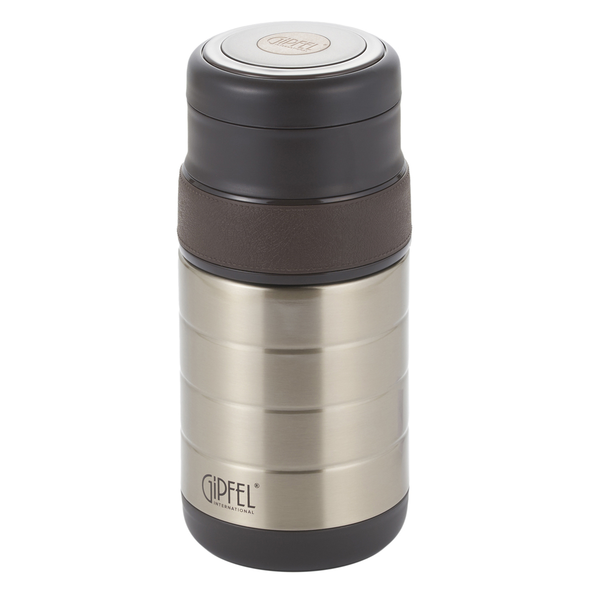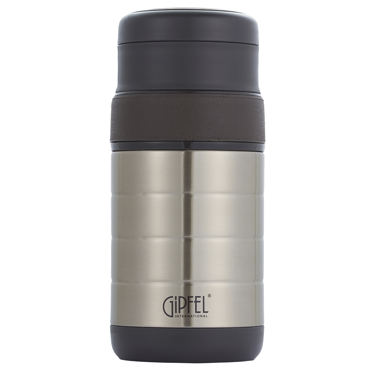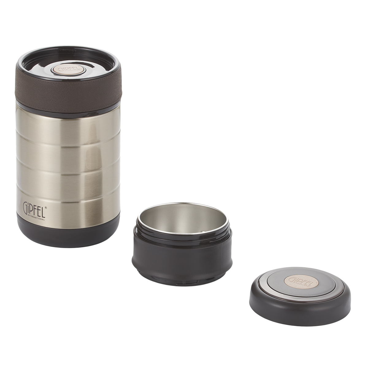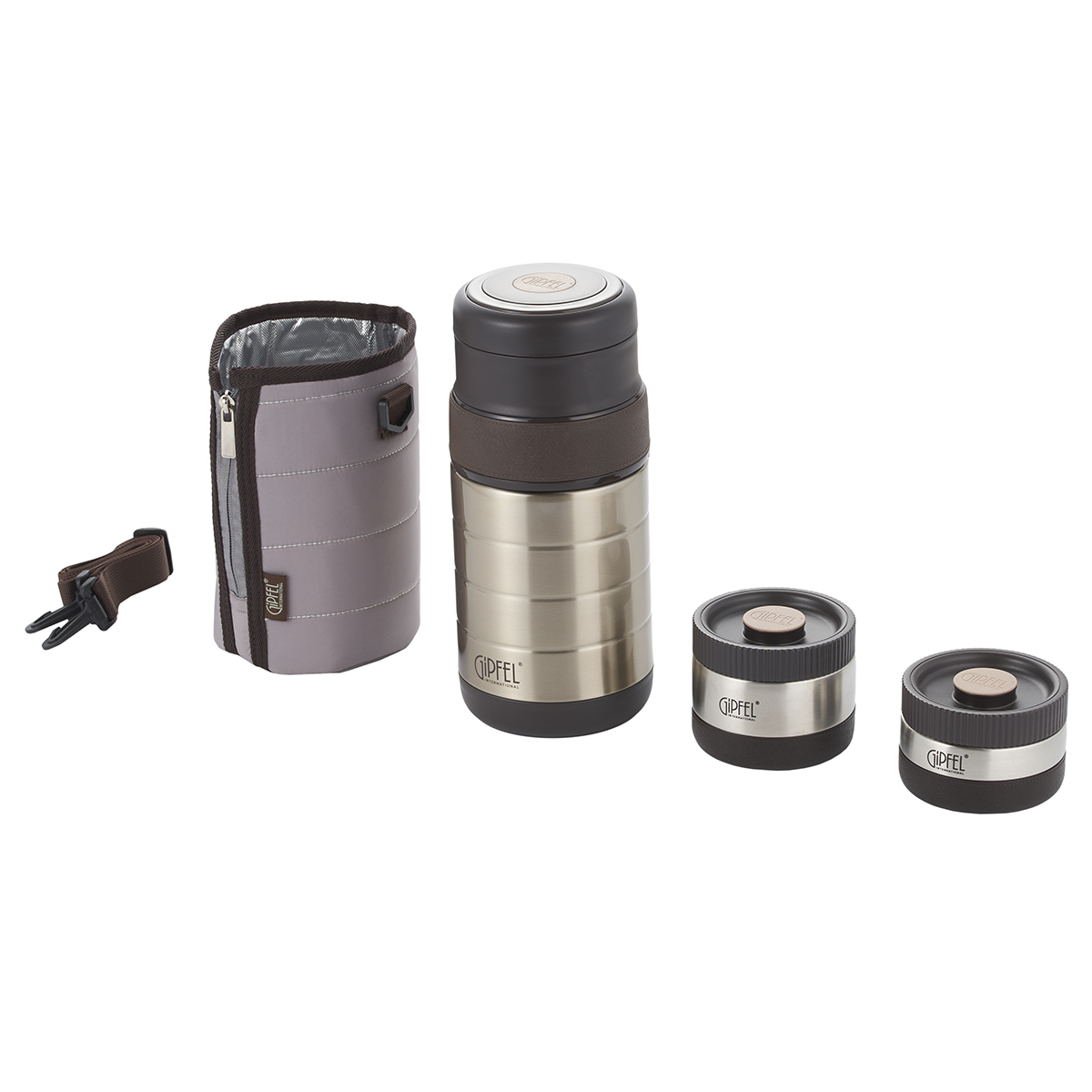 Набор контейнеров для еды GIPFEL KLOSS 8212. В комплект входят термос вакуумный с широким горлом 1000мл, 2 контейнера для еды 300мл и 400мл, сумка. Материал: нержавеющая сталь 18/10. В крышку термоса встроен еще один контейнер. Для удобства и во избежание скольжения контейнеры обернуты экокожей. Нижние накладки на маленьких контейнерах снимаются для удобства мытья. Крышки сделаны из высокопрочного пластика. Сумочка идеально подходит под диаметр контейнеров имеет замок, в ней удобно переносить либо термос, либо маленькие контейнеры, поставив друг на друга. В комплекте к сумочке поставляется тряпичный ремень на карабинах, что позволяет носить ее на плече. не занимая рук или место в рюкзаке. Высота термоса - 25см, диаметр дна термоса - 10см. Высота сумки 19 см.