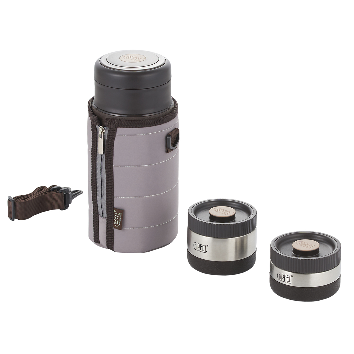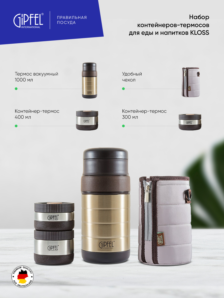 Набор контейнеров для еды Gipfel KLOSS 8212. В комплект входят термос вакуумный с широким горлом 1000мл, 2 контейнера для еды 300мл и 400мл, сумка.