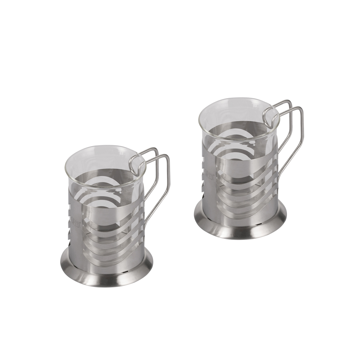 Набор кружек Gipfel Glacier-Toulouse 7181. В наборе две кружки в стальных подстаканниках объемом 200 мл. Кружки выполнены из боросиликатного стекла, имеют толстые стенки и хорошо держат тепло. Подстаканники с ручками и волнообразным узором сделаны из хирургической стали 18/10.