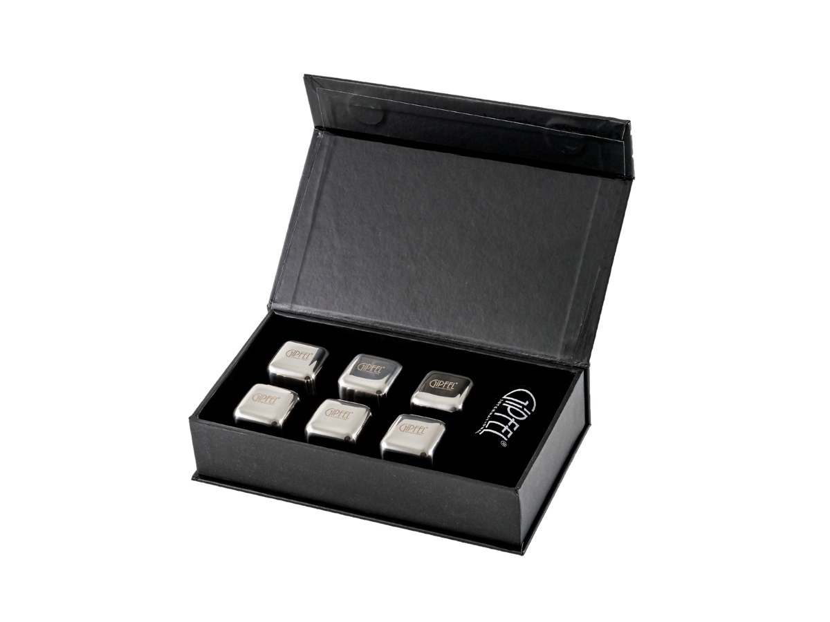Набор кубиков для виски Gipfel 2115. Набор из 6 стальных кубиков размером 26x26мм. Кубики сделаны из хирургической стали 18/10. Кубики используются для охлаждения напитка, так как они долго остаются холодными. В комплекте идет черный вельветовый чехол с фирменным логотипом. Набор упакован в подарочную черную коробку.