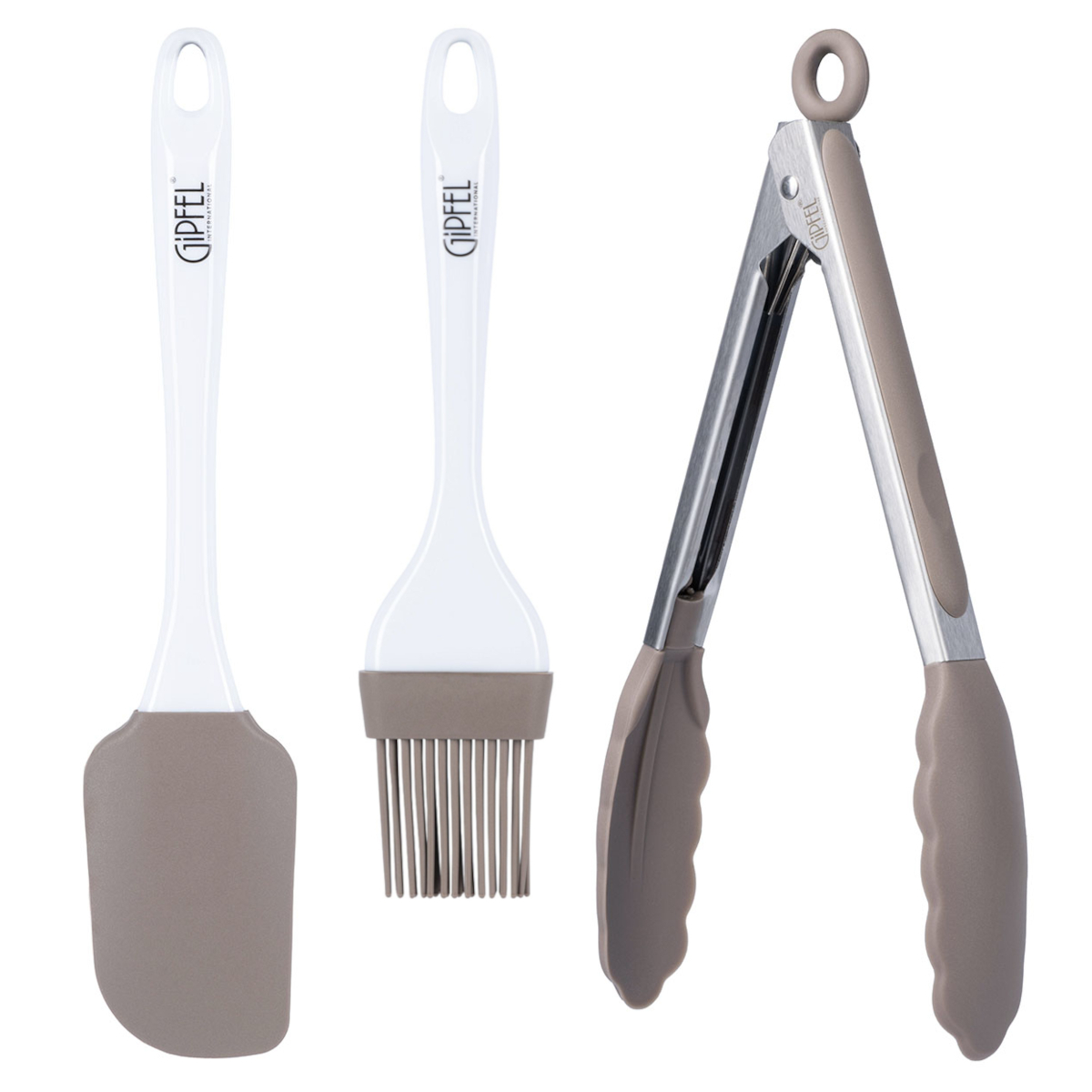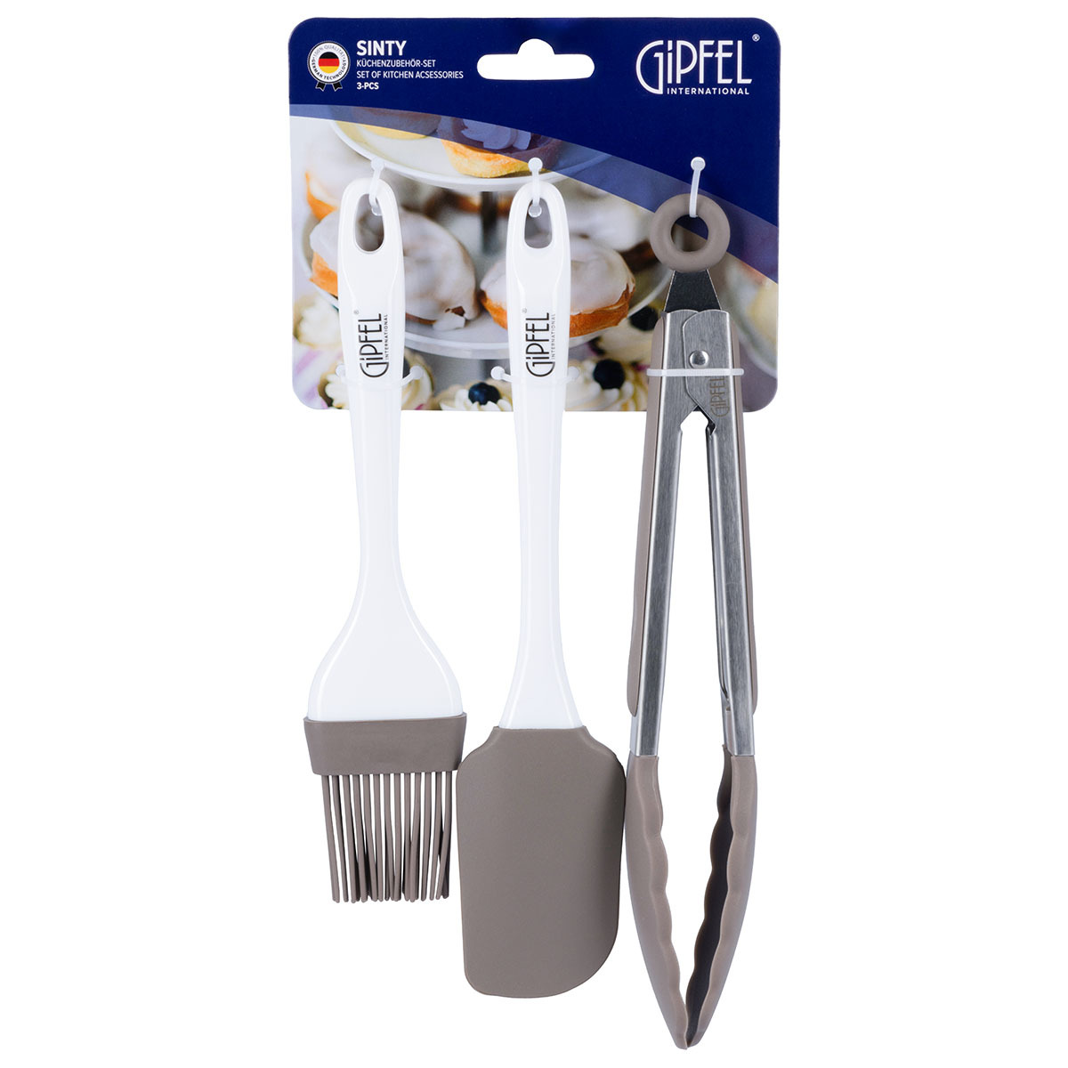 Набор кухонных аксессуаров Gipfel Sinty 51728. Инструменты изготовлены из силикона и подойдут для использования с антипригарной посудой. В наборе 3 предмета: щипцы 23 см, кисточка 22 см, лопатка 25 см.