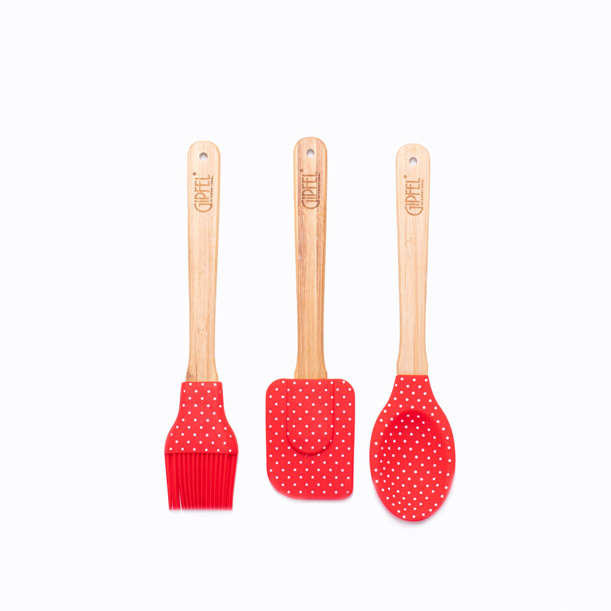 Набор кухонных аксессуаров Gipfel SINTY 6325. В наборе 3 предмета: ложка 26,5 см, лопатка 25,5 см, кисточка 26 см. Ручки инструментов сделаны из бамбука, рабочая часть силиконовая. Яркий и необычный набор лопаток для кухни впишется в интерьер кухни, оформленной в стиле кантри.