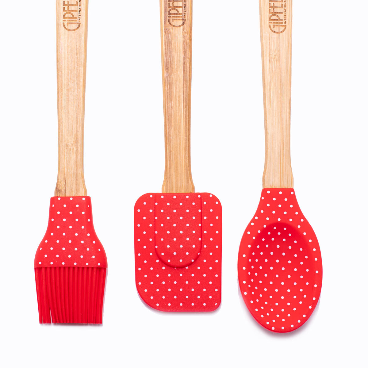 Яркий и необычный набор лопаток для кухни впишется в интерьер кухни, оформленной в стиле кантри. Предметы выполнены из бамбука и красного силикона в белый горошек. Набор аксессуаров состоит из трех предметов: кисточки, лопатки и ложки. Они помогут в приготовлении блюд — от тушеных овощей и румяных ребрышек до нежнейших воздушных десертов. Поскольку рабочая часть выполнена из силикона, она не поцарапает антипригарное покрытие сковороды или формы для выпечки. Материал термоустойчивый, не выделяет вредных соединений и безопасен даже для детской кухни. Ручка из бамбука не расплавится от горячей кастрюли и сохранит прочность в течение интенсивной эксплуатации. Аксессуары не требуют особого ухода, легко моются губкой и средством для мытья посуды.
