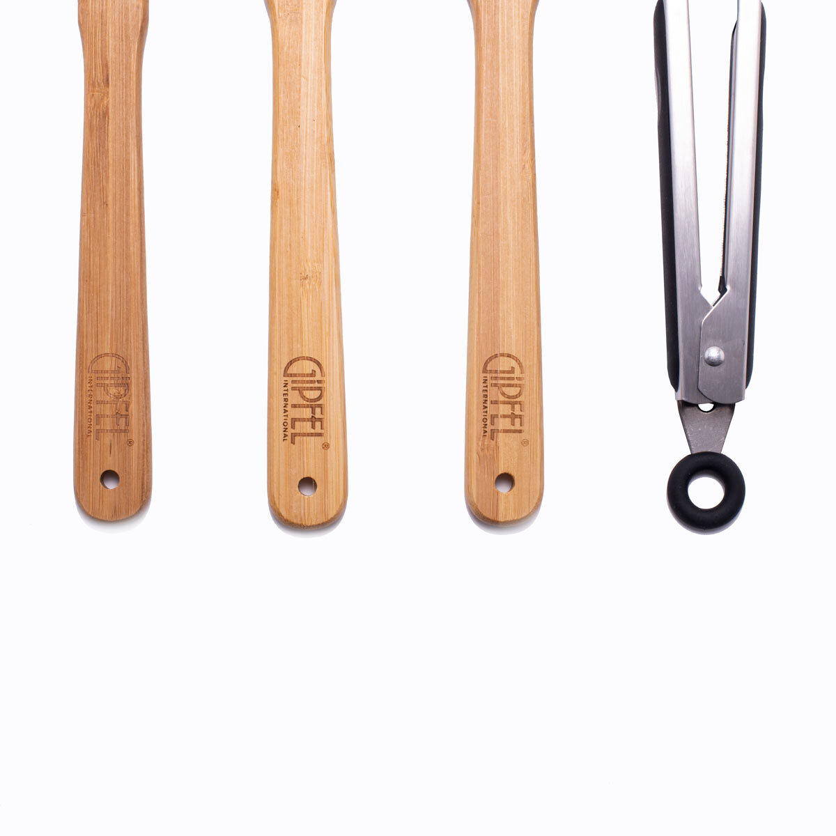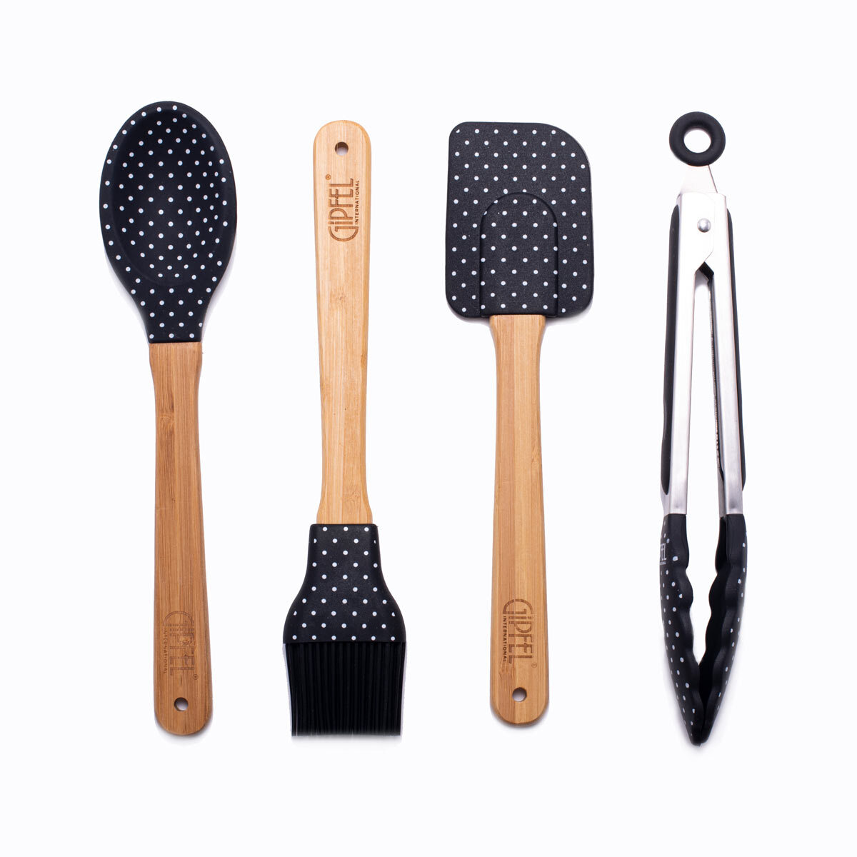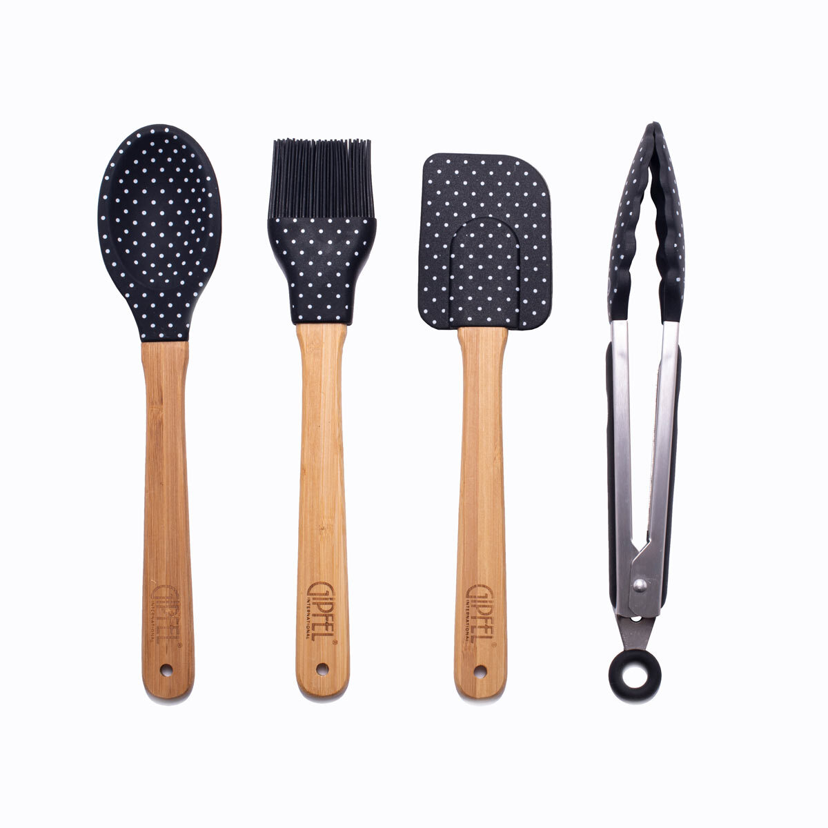 Набор кухонных аксессуаров Gipfel SINTY 6333 из 4 предметов. В наборе: щипцы 23 см, кисточка 26 см, лопатка 25 см, ложка 26 см. Предметы сделаны из силикона и имеют бамбуковые ручки с отверстиями для подвешивания. Щипцы выполнены из нержавеющей стали и имеют кольцо-фиксатор, которое позволяет держать их в сложенном состоянии. Предметы имеют расцветку рабочей части черного цвета в белый горох.