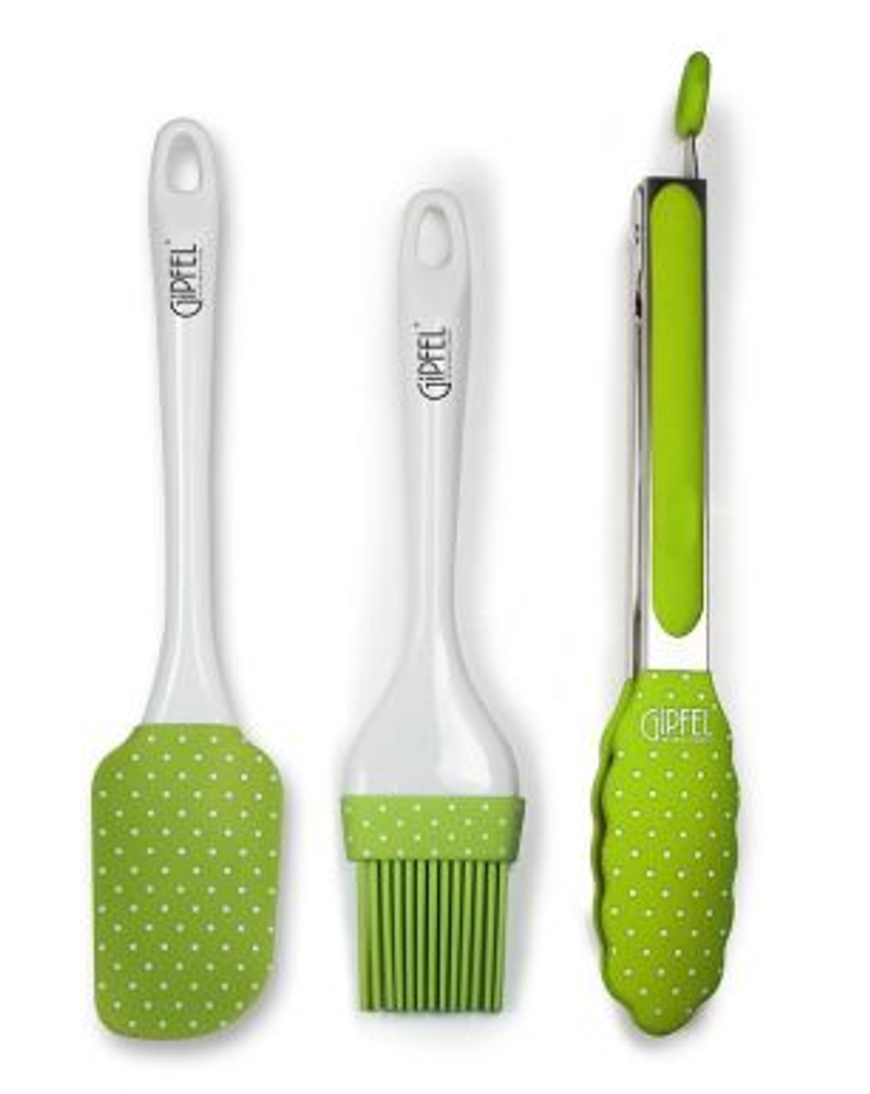 Набор кухонных аксессуаров Gipfel SINTY 6334. Набор состоит из 3 предметов: щипцы 23 см, кисточка 22 см, лопатка 25 см. Рабочая поверхность сделана из зеленого силикона. Ручки из пластика и нержавеющей стали.