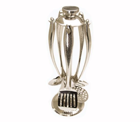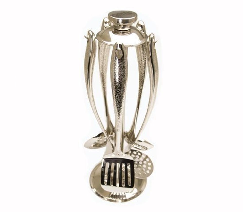 Набор кухонных аксессуаров GIPFEL VERDE 2173. В наборе 5 аксессуаров на подставке: половник 33см, лопатка с прорезями 37см, шумовка 37см, ложка 37см, толкушка 32см. Набор сделан из нержавеющей стали с зеркальной полировкой. Благодаря подставке, инструменты очень удобно хранить, подвесив вертикально.
