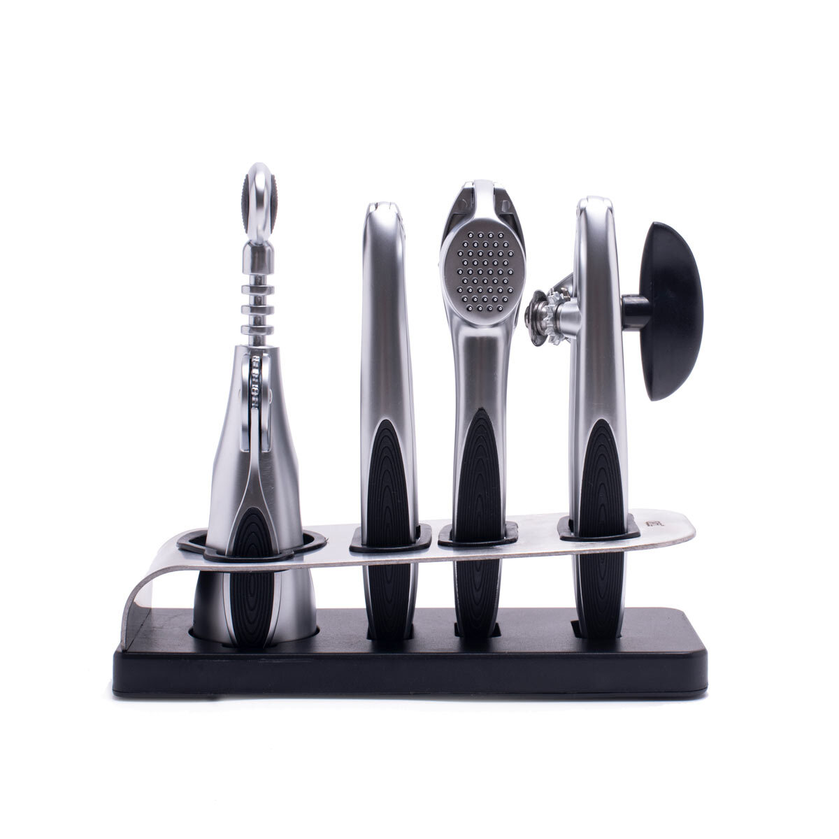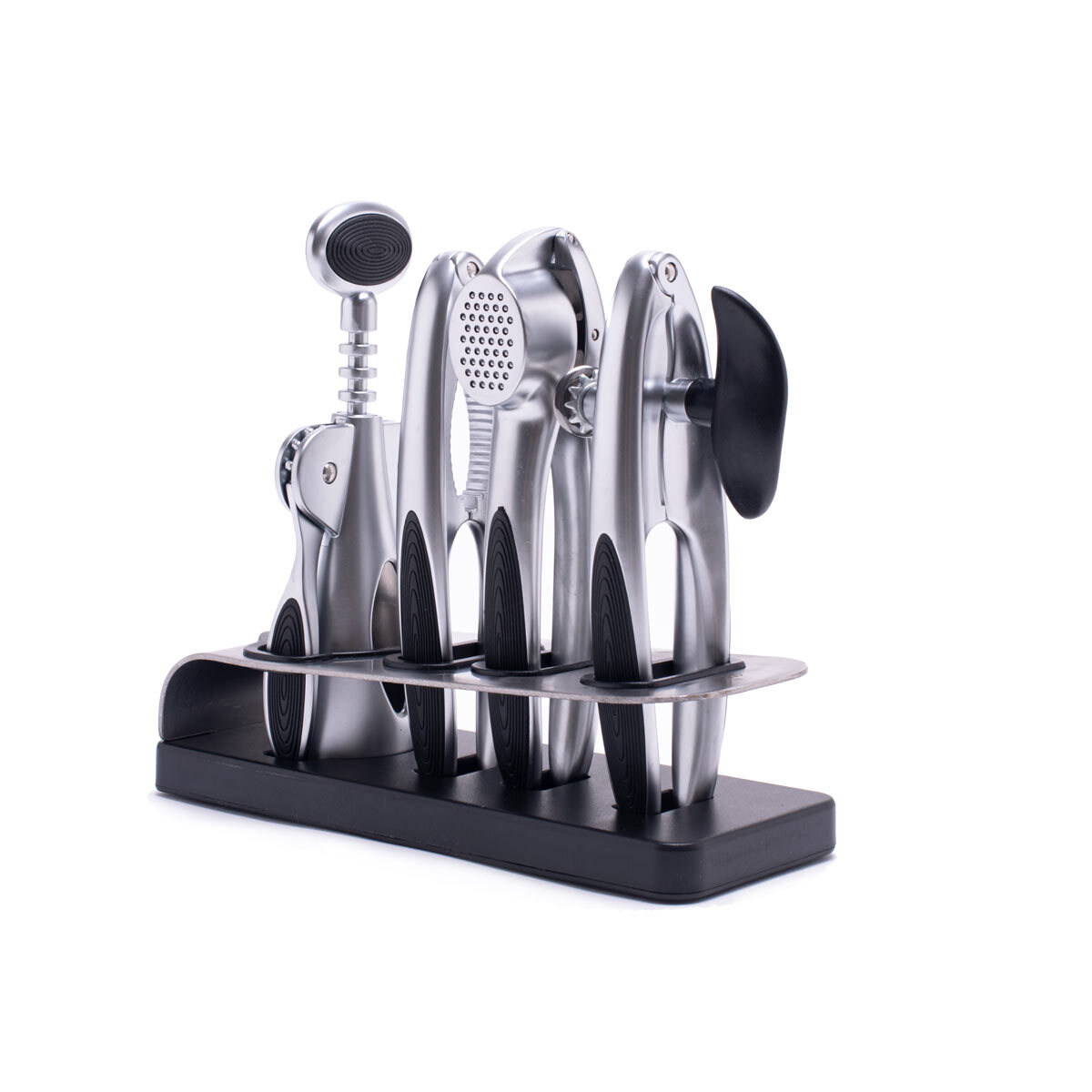 Набор кухонных принадлежностей Gipfel BRAVO 6075 из 5 предметов. В наборе: консервный нож, орехокол, пресс для чеснока, штопор, подставка. Набор выполнен из цинкового сплава из элементами из термопластичной резины и пластика. Упакован в фирменную подарочную коробку.