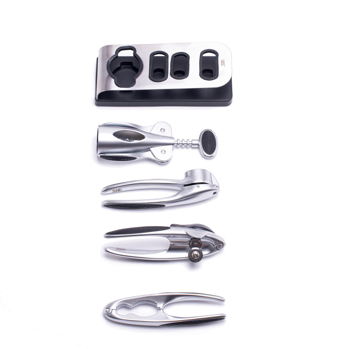 Набор кухонных принадлежностей GIPFEL BRAVO 6075 из 5 предметов. В наборе: консервный нож, орехокол, пресс для чеснока, штопор, подставка. Набор выполнен из цинкового сплава из элементами из термопластичной резины и пластика. Упакован в фирменную подарочную коробку.