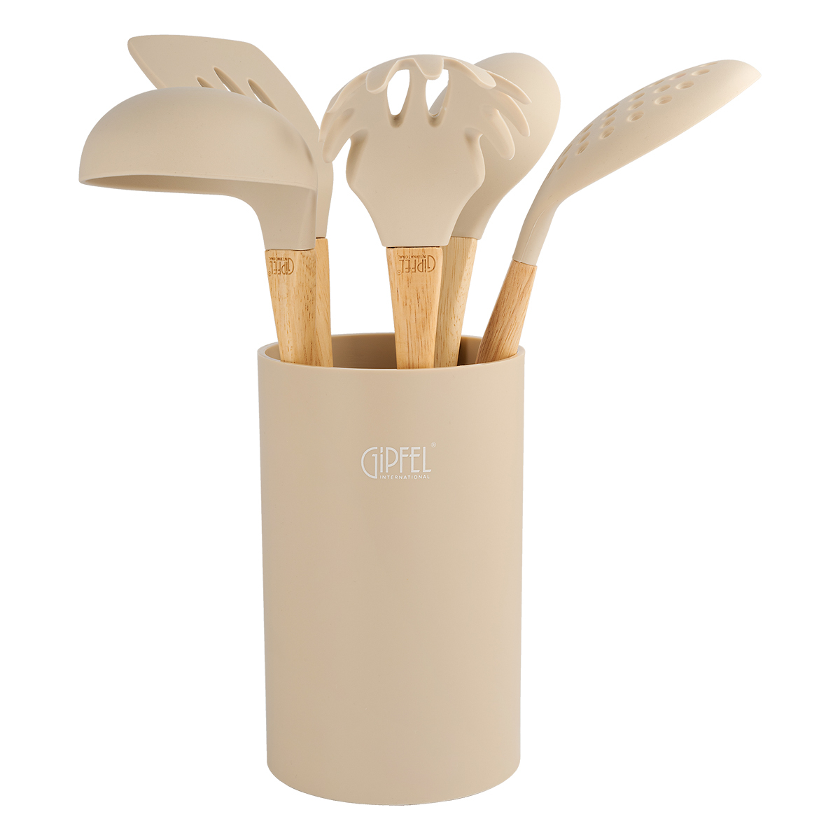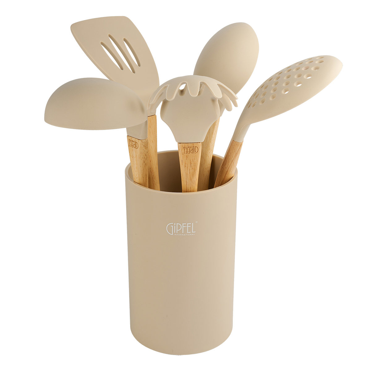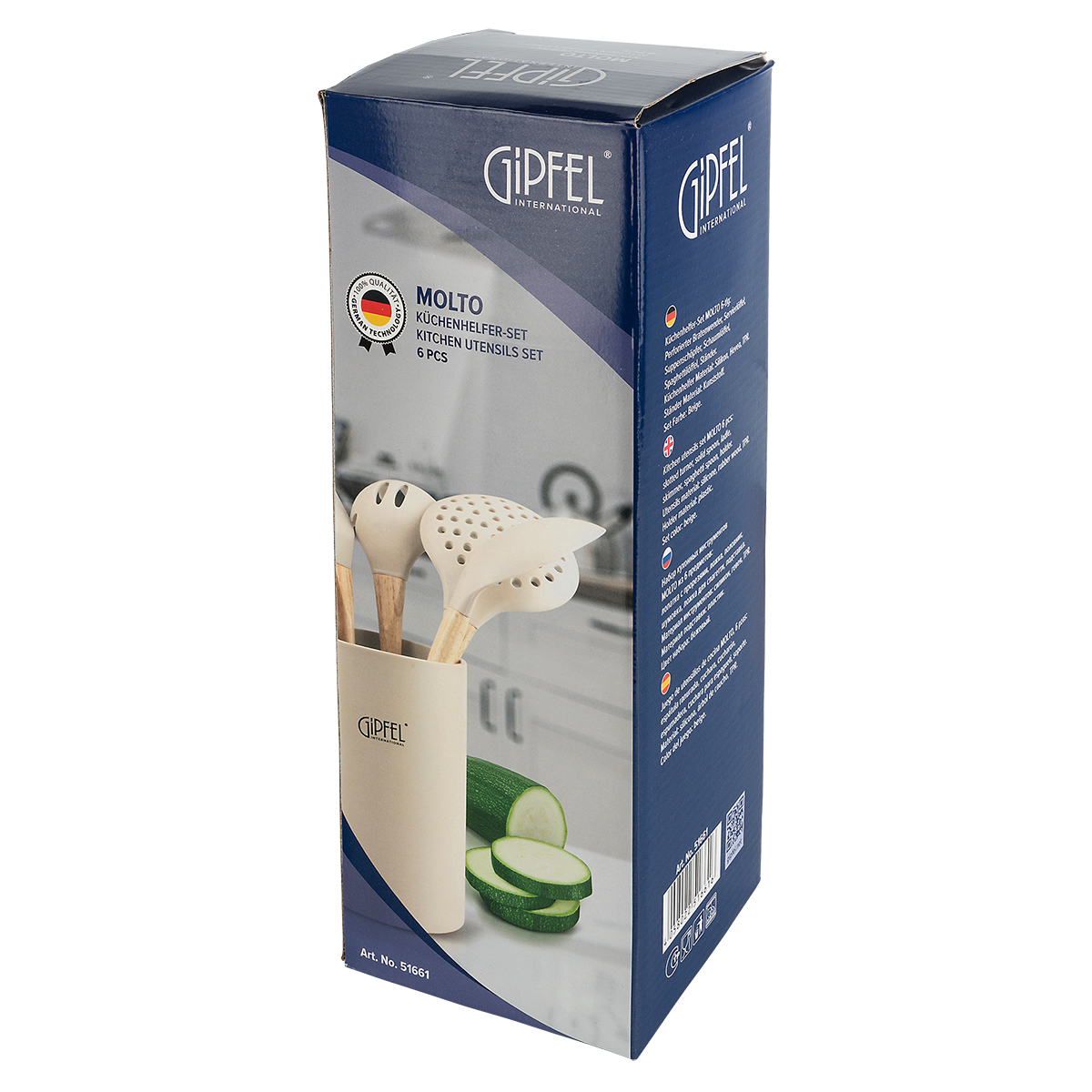 Набор кухонных инструментов GIPFEL MOLTO 51661. В наборе 6 предметов: лопатка с прорезями, ложка, половник, шумовка, ложка для спагетти, подставка. Ручки инструментов изготовлены из дерева гевеи. Рабочая часть из силикона, что позволит использовать инструменты с антипригарной посудой. Вес 822 гр.