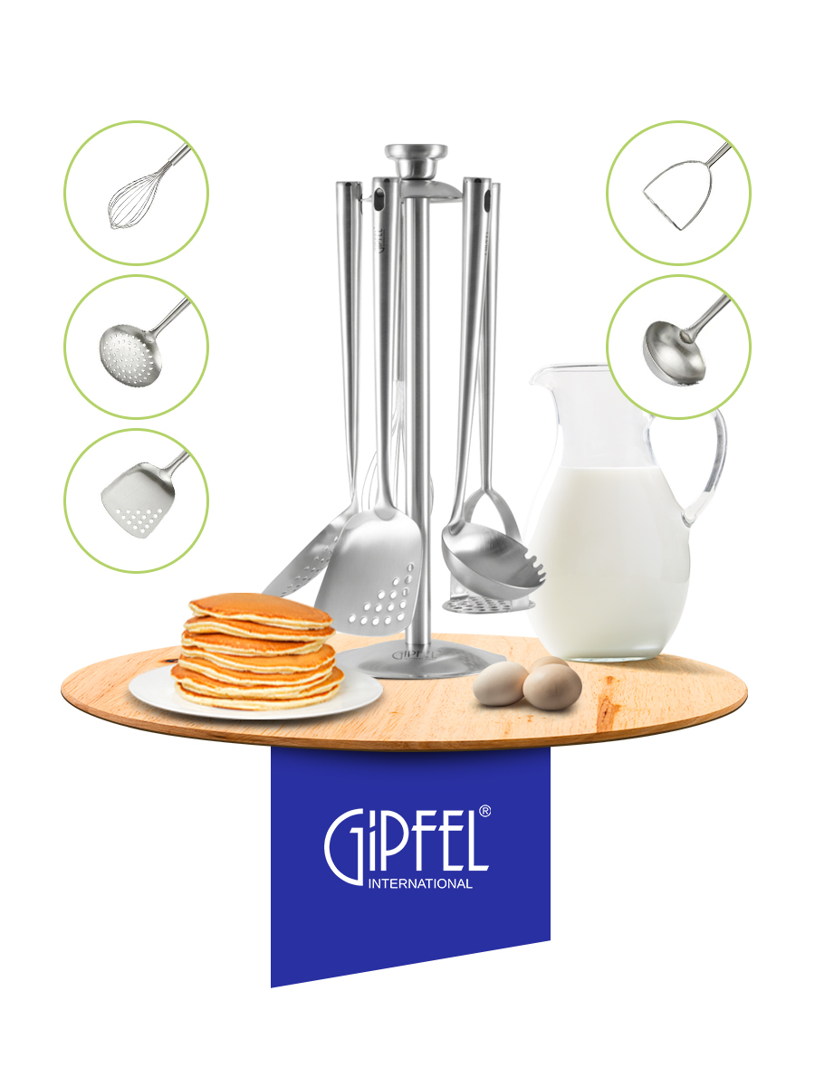 Набор кухонных инструментов MONCLER GIPFEL 6074 из 5 предметов на подставке В наборе кухонные аксессуары из нержавеющей стали: лопатка, шумовка, венчик, половник, толкушка. Длина инструментов - 30 см, длина подставки - 40 см.
