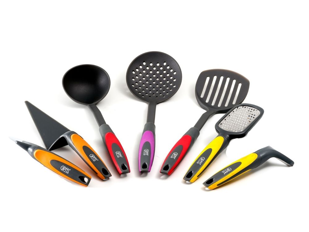 Набор кухонных инструментов GIPFEL TRAMONTO 6472. Набор из 7 предметов ПВХ-тубусе. В наборе: шумовка, лопатка, лопатка с прорезями, половник, терка, нож для чистки овощей, резак для пиццы.
